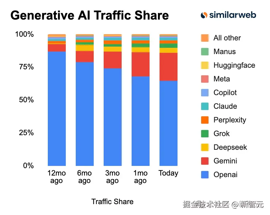如开头所言,Similarweb 的这张流量对比图,揭示了一个让 OpenAI 极其危险的信号——AI 竞赛的风向,变了!