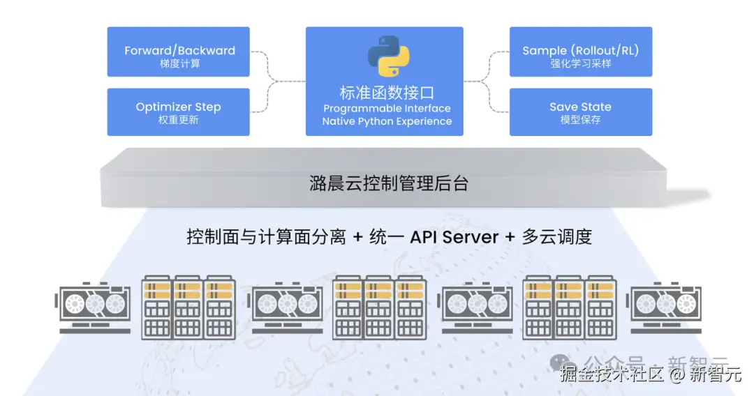 开发者只需描述数据与算法,其余(租卡、配环境、并行策略、运维调度、故障自愈,乃至 RL 涉及的一系列工程化的工作)全部下沉到用户无感。