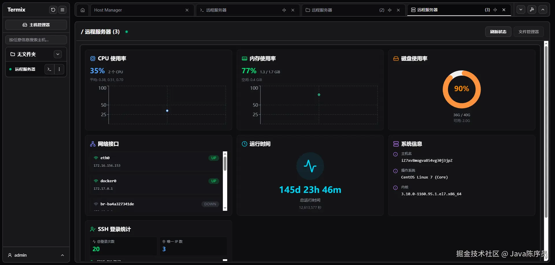 - 全面的服务器监控:通过仪表盘直观地展示 SSH 服务器的 CPU、内存、磁盘使用率、网络流量与系统运行时间等信息