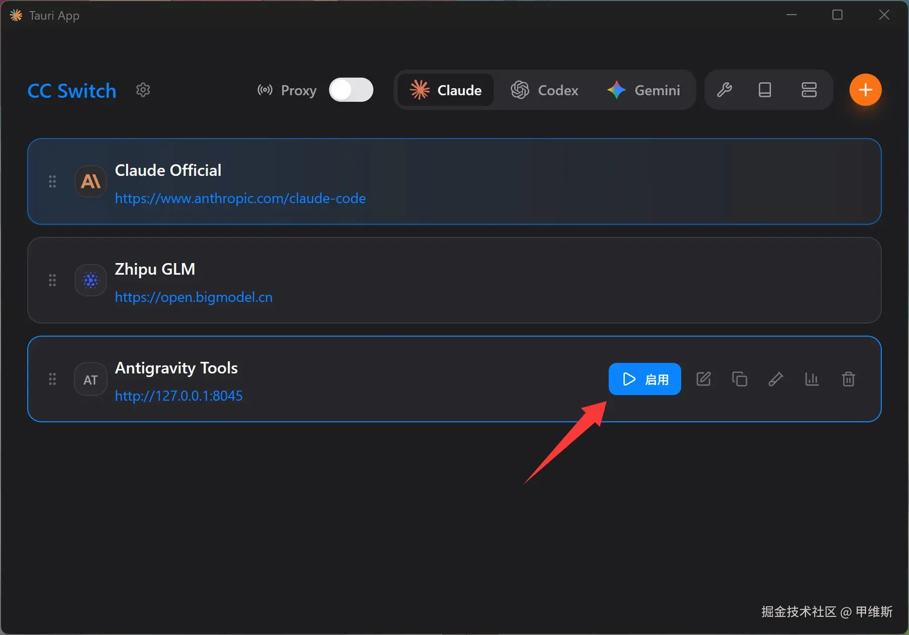 我们上面取了名字叫 Antigravity Tools,所以就启用这一个。