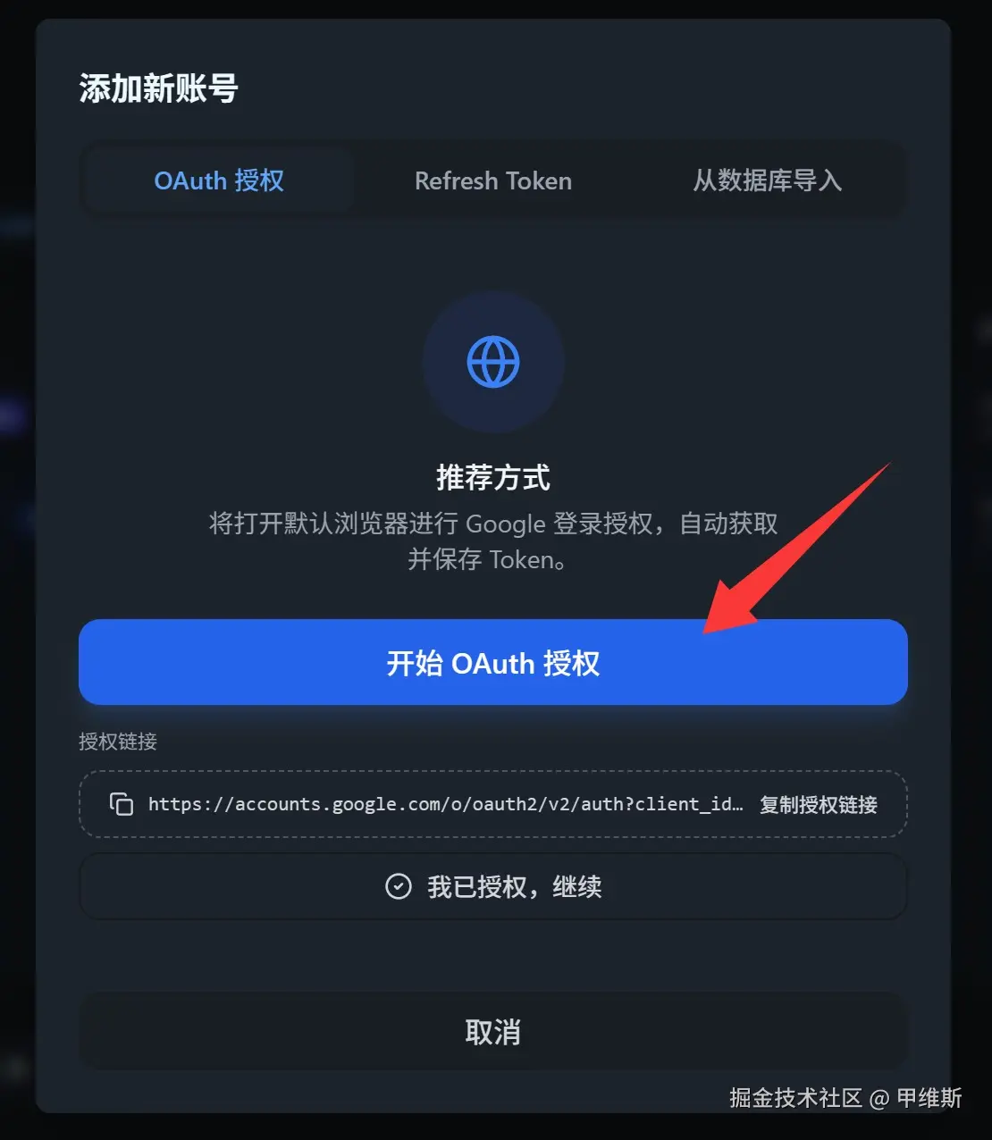 点击开始授权,使用 Google 账号登录和授权就可以了。