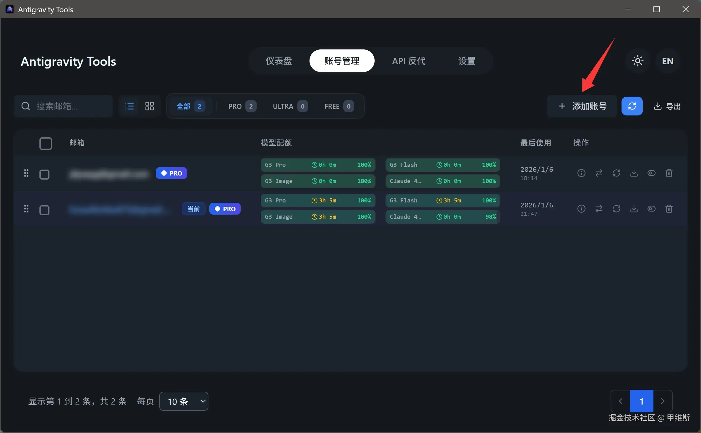 我的截图中已经添加了两个 Pro 的账号。可以通过下面的列表查看具体的配额和重置时间。