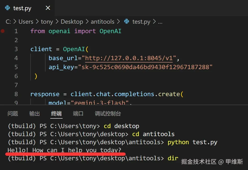 运行代码之后,只要有类似“Hello! How can I help you today ? ” 就证明成功了 。