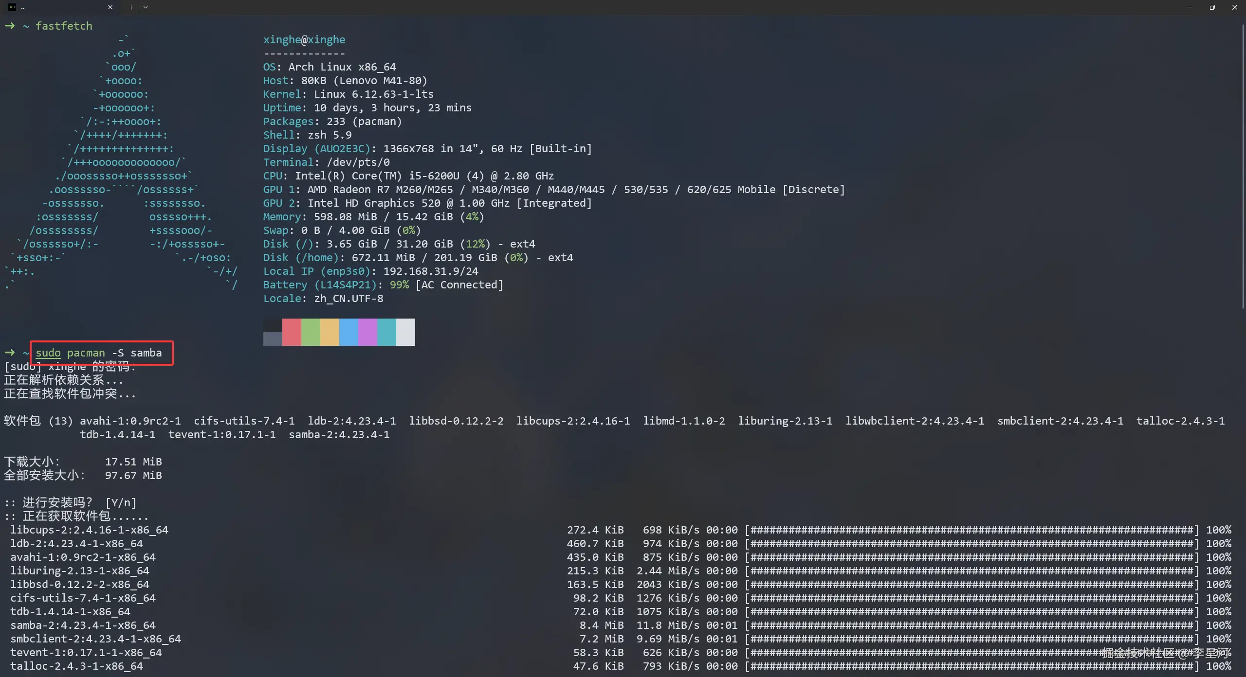 (注:不同Linux发行版安装命令略有不同,Ubuntu用户请用 sudo apt install samba)