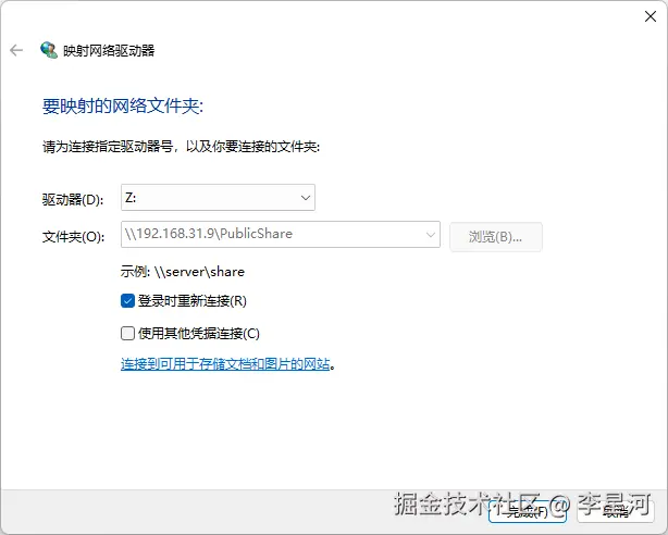 勾选“使用其他凭据连接”(如果是私密模式),输入刚才设置的账号