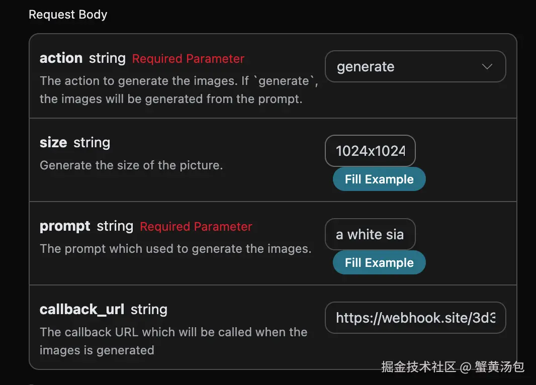 首先先了解下基本的使用方式,就是输入提示词 prompt、 生成行为 action、图片尺寸 size,便可获得处理后的结果,首先需要简单地传递一个 action 字段,它的值为 generate,然后我们还需要输入提示词,具体的内容如下:
