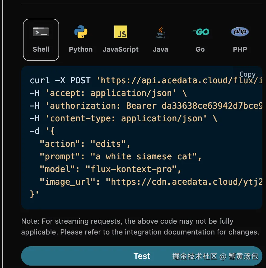 另外如果想生成对应的对接代码,可以直接复制生成,例如 CURL 的代码如下: