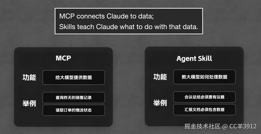 - • Skill 是认知模具(Cognitive Schema):解决“数据怎么用”的问题。