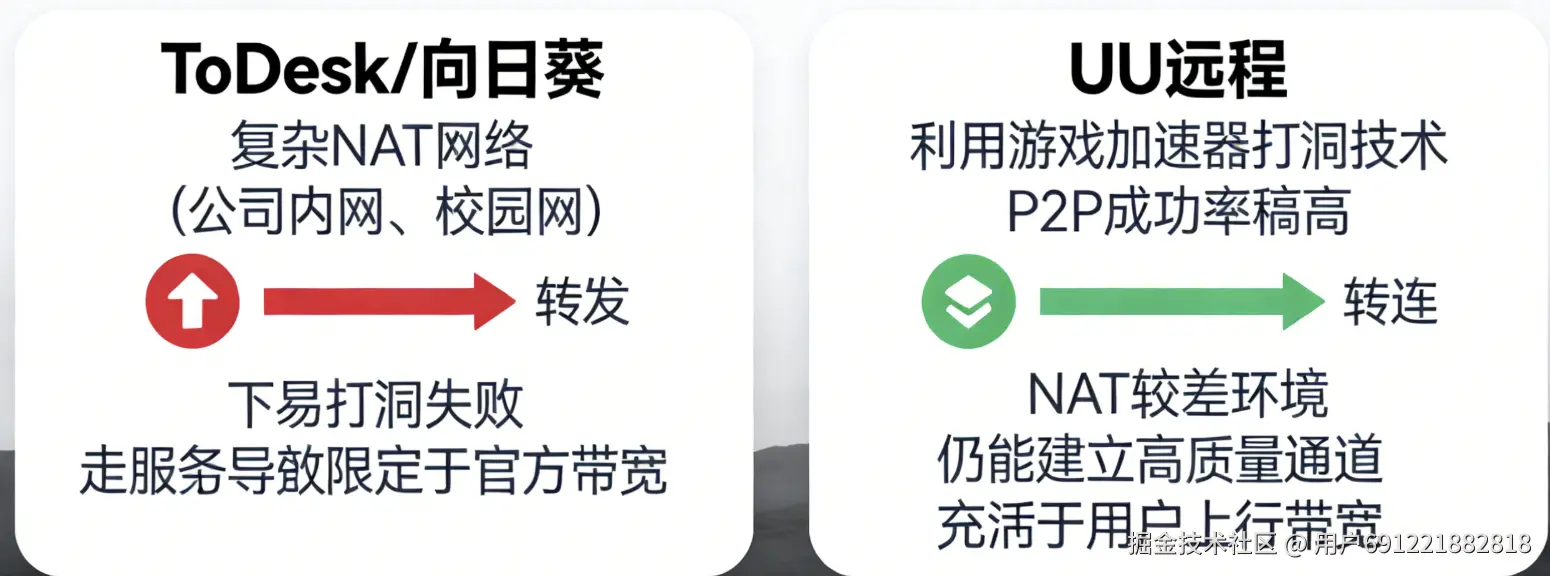 - UU远程:利用了游戏加速器的打洞技术,P2P成功率极高。即使在NAT类型较差的环境下,也能建立高质量通道,充分利用用户自身的上行带宽。