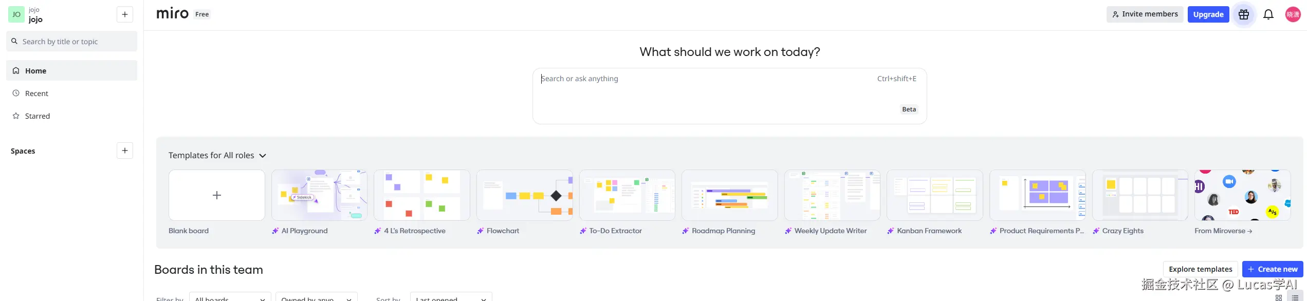 Miro 是目前最成熟的在线协作白板,支持无限画布,让团队可以在一个大画布上进行头脑风暴、流程规划、结构图等。