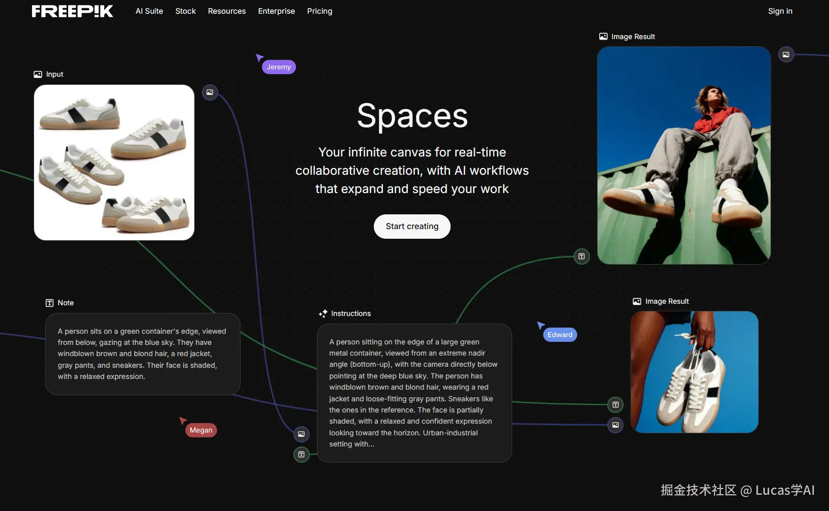 - Freepik Spaces 可以让团队实时协同构建创意流程,在画布上组织节点(如文字、图像、视频、AI任务)。