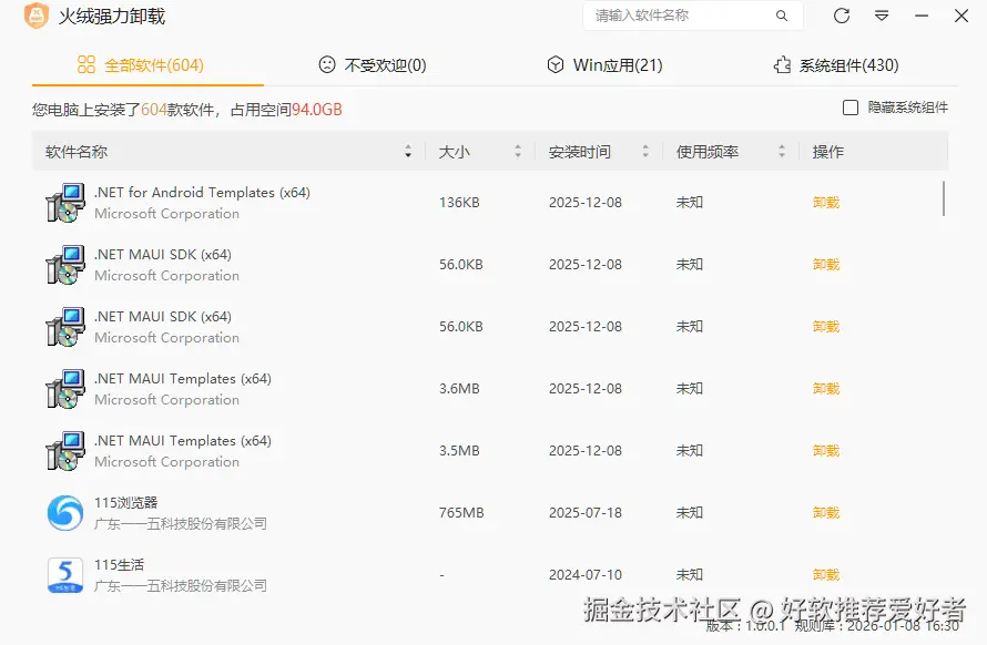 工具界面清晰展示电脑已安装软件全貌,支持按 “全部软件”“不受欢迎”“Win 应用”“系统组件” 分类筛选,还可隐藏系统组件避免误操作。同时,界面会显示软件安装时间、使用频率、占用空间等关键信息,方便用户快速定位目标软件。