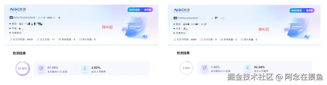 真实体验: 我测试了一段法学论文,效果还行,确实把明显的AI味去掉了。但它改后的字数可能会增多,它每天有10次免费的AIGC率检测,这个羊毛可以薅。