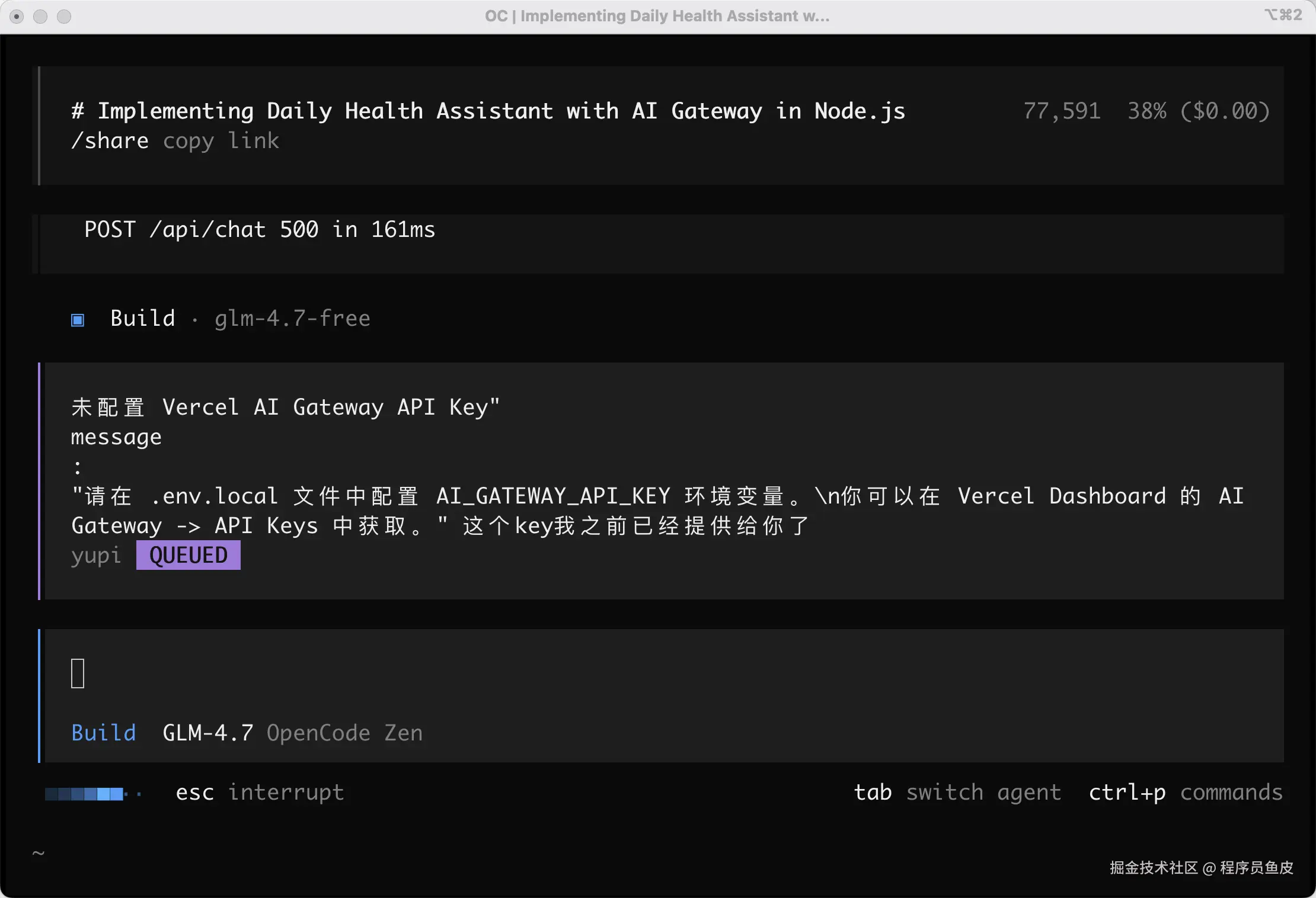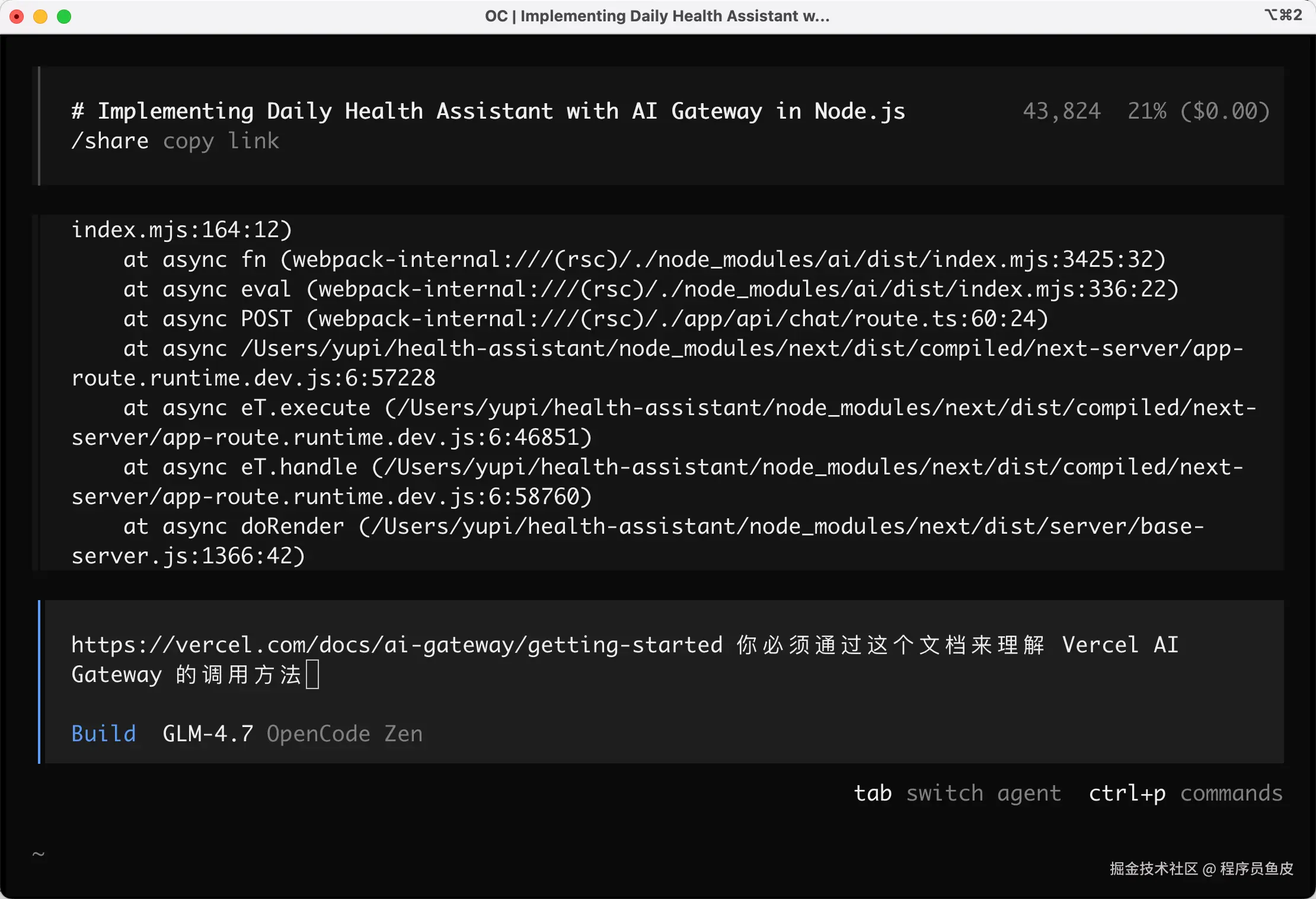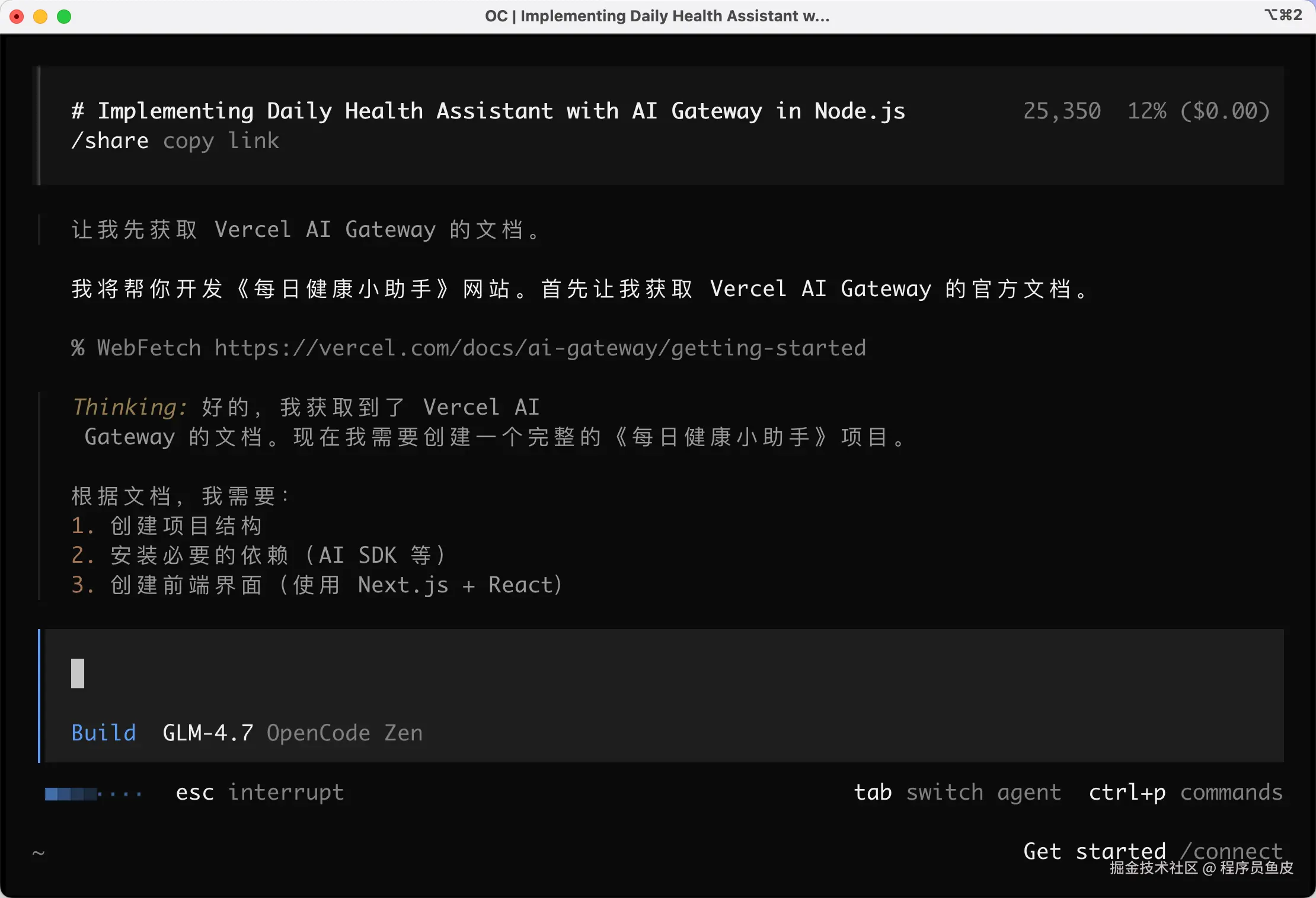 点击发送后,OpenCode 会自动使用网页抓取工具读取 Vercel AI Gateway 的官方文档,学习最新的用法: