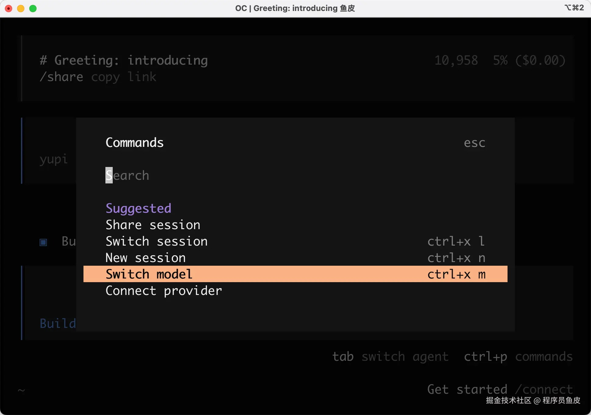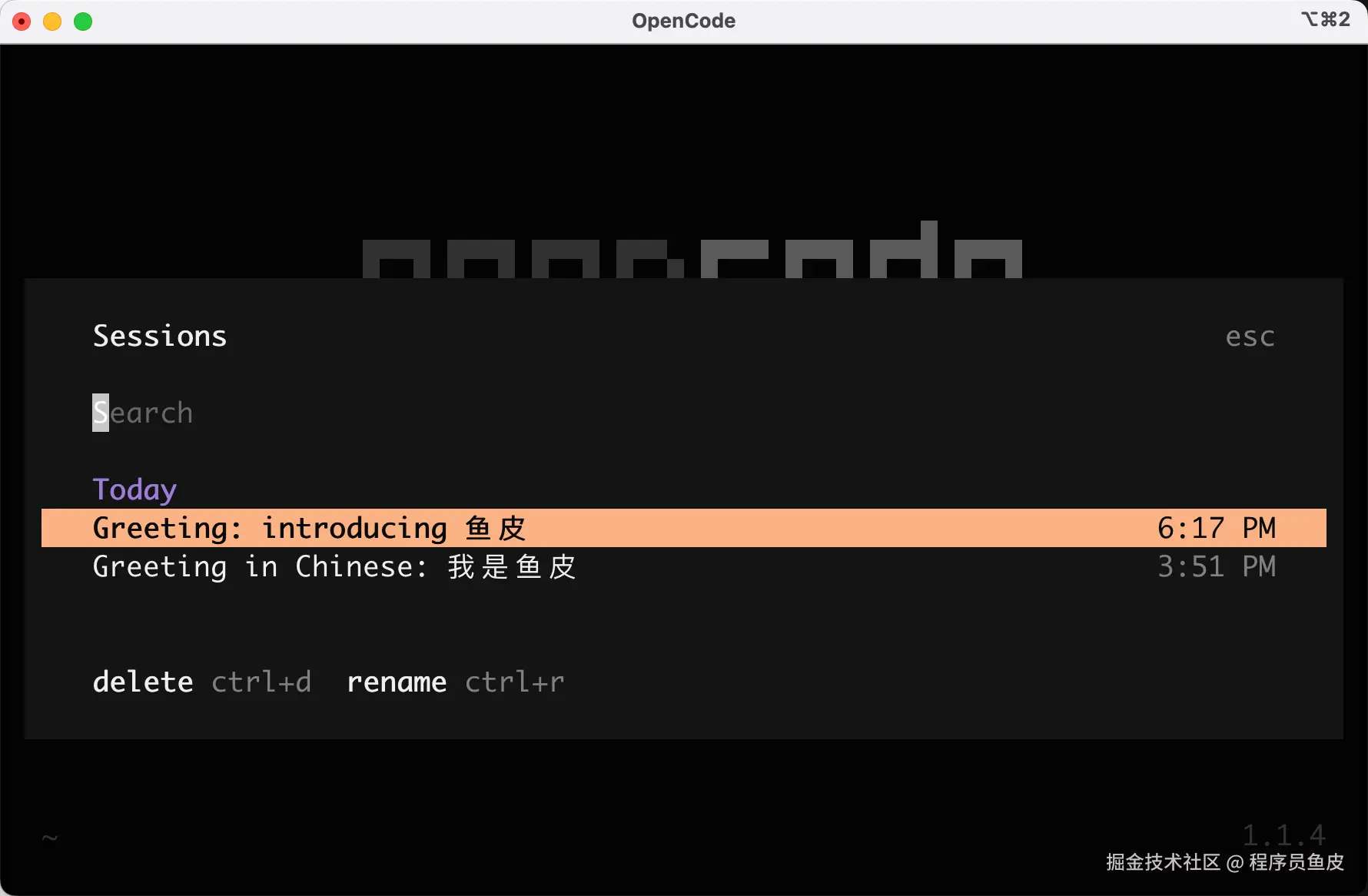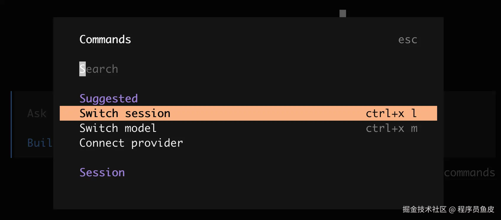 如果你不小心关闭了 OpenCode,不用担心,可以打开命令面板,选中 “Switch session” 切换会话: