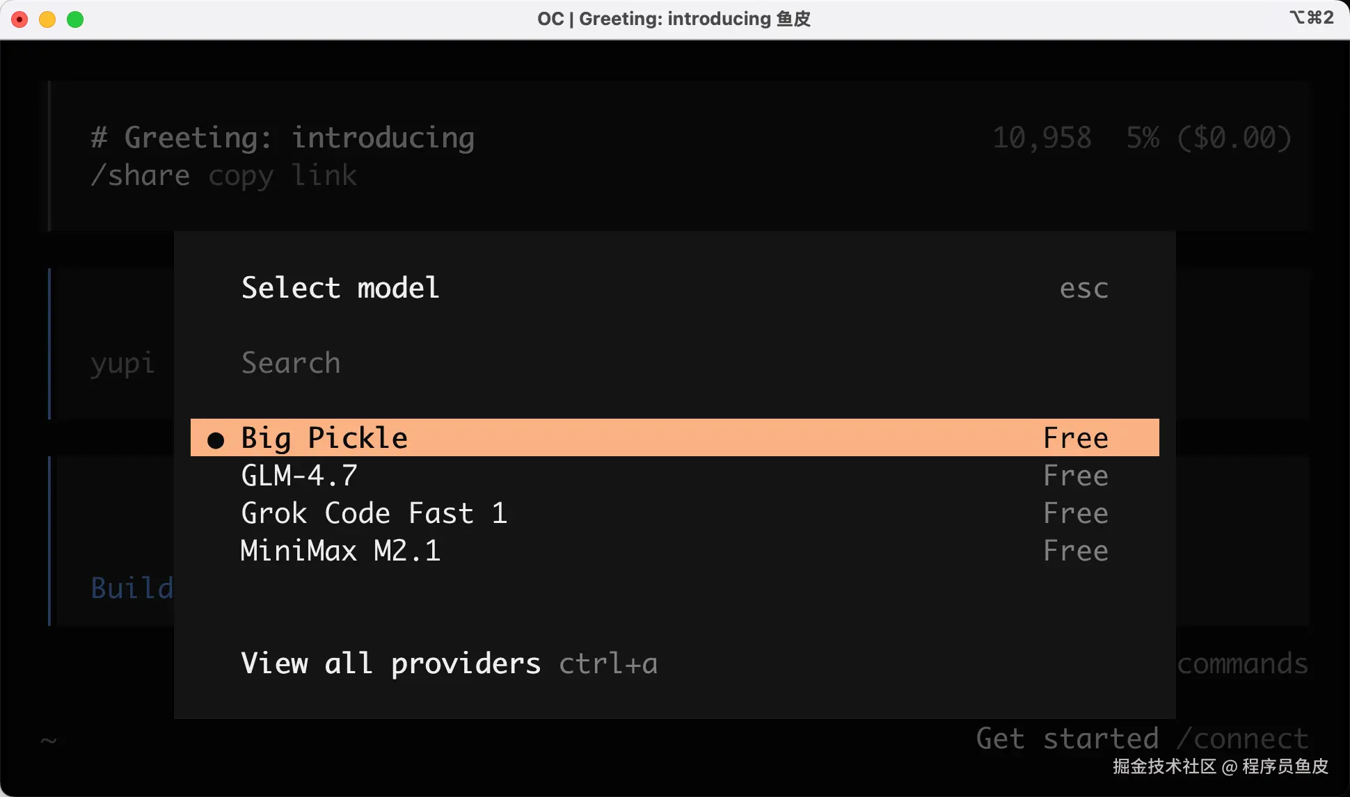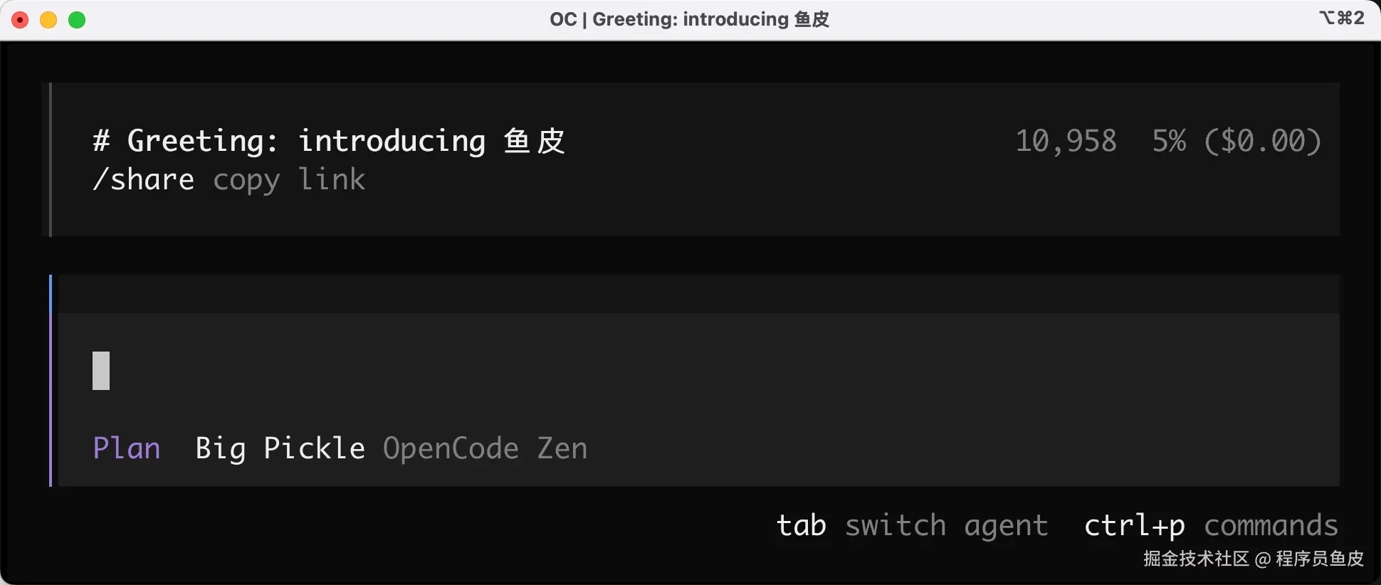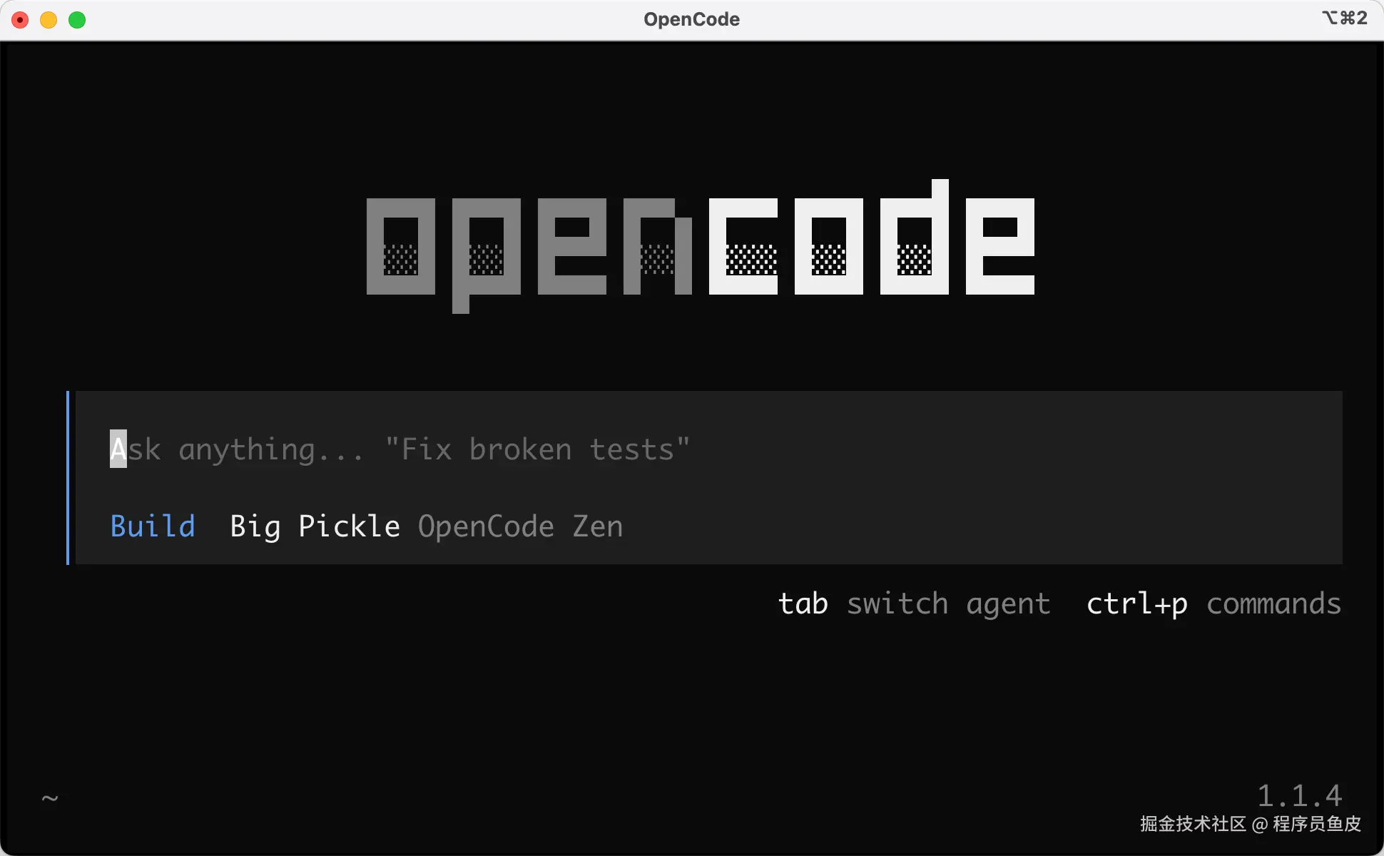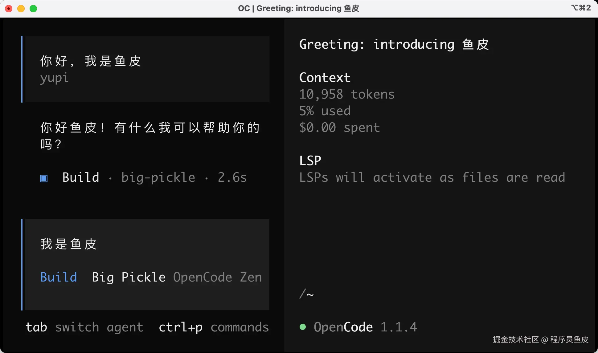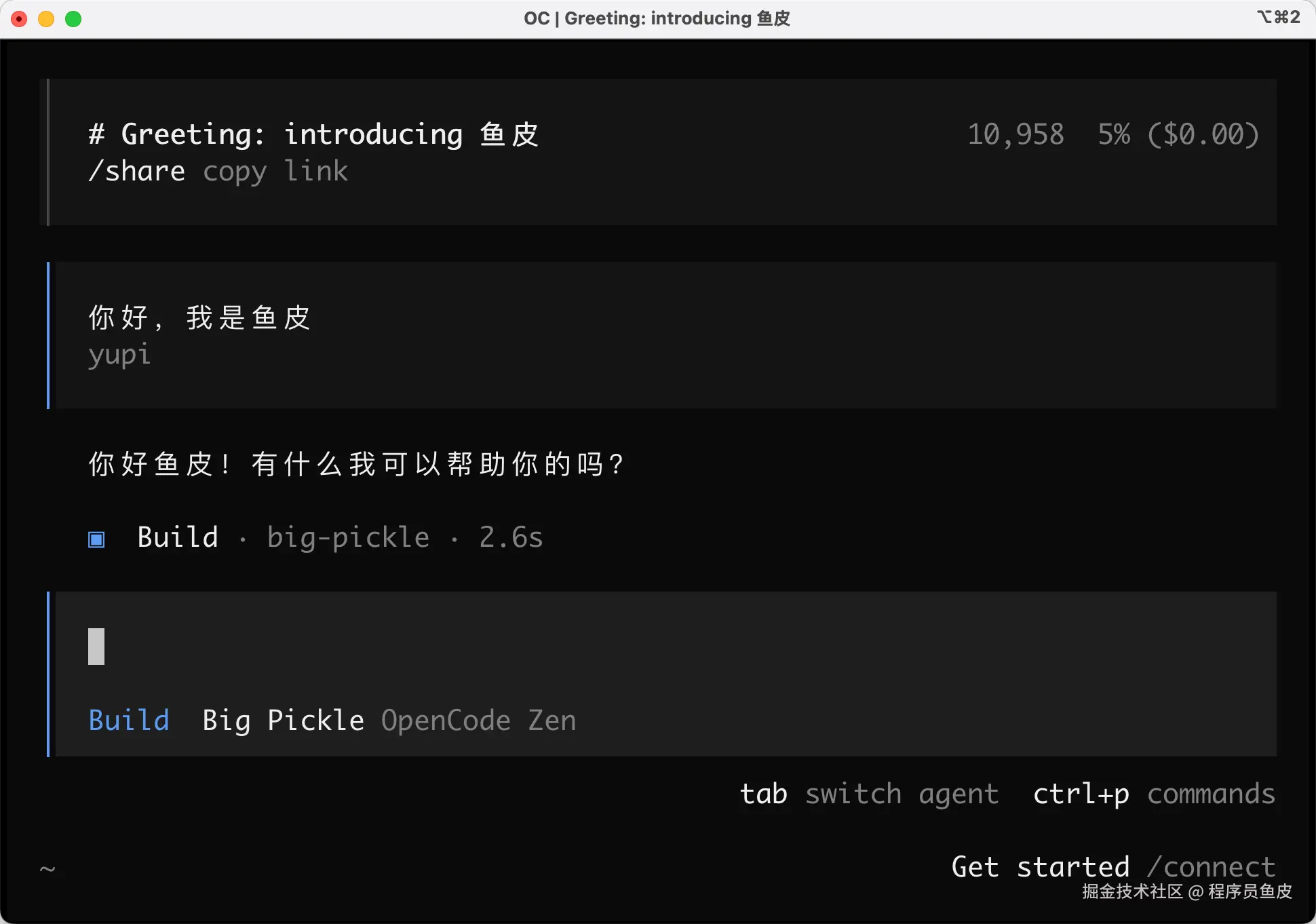 安装完成之后,输入 opencode 进入程序,接下来你就可以愉快地使用了~