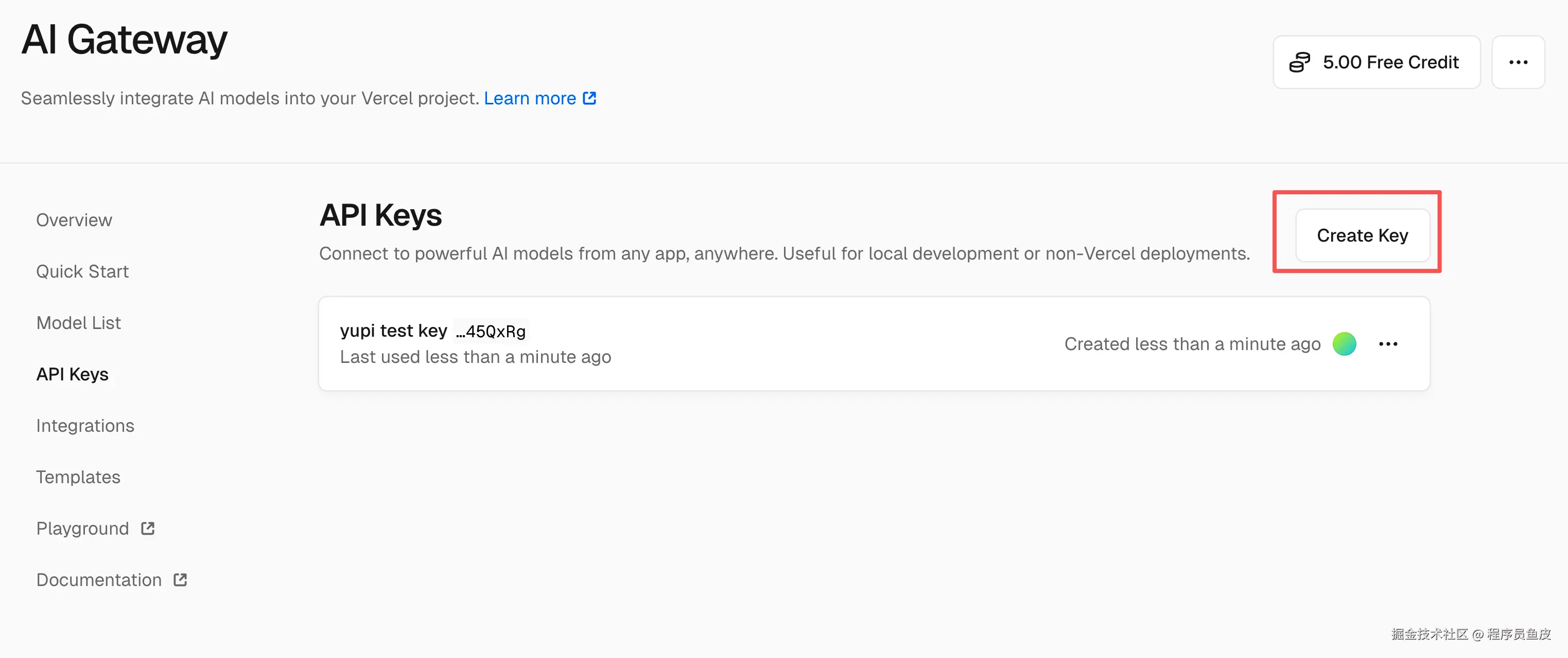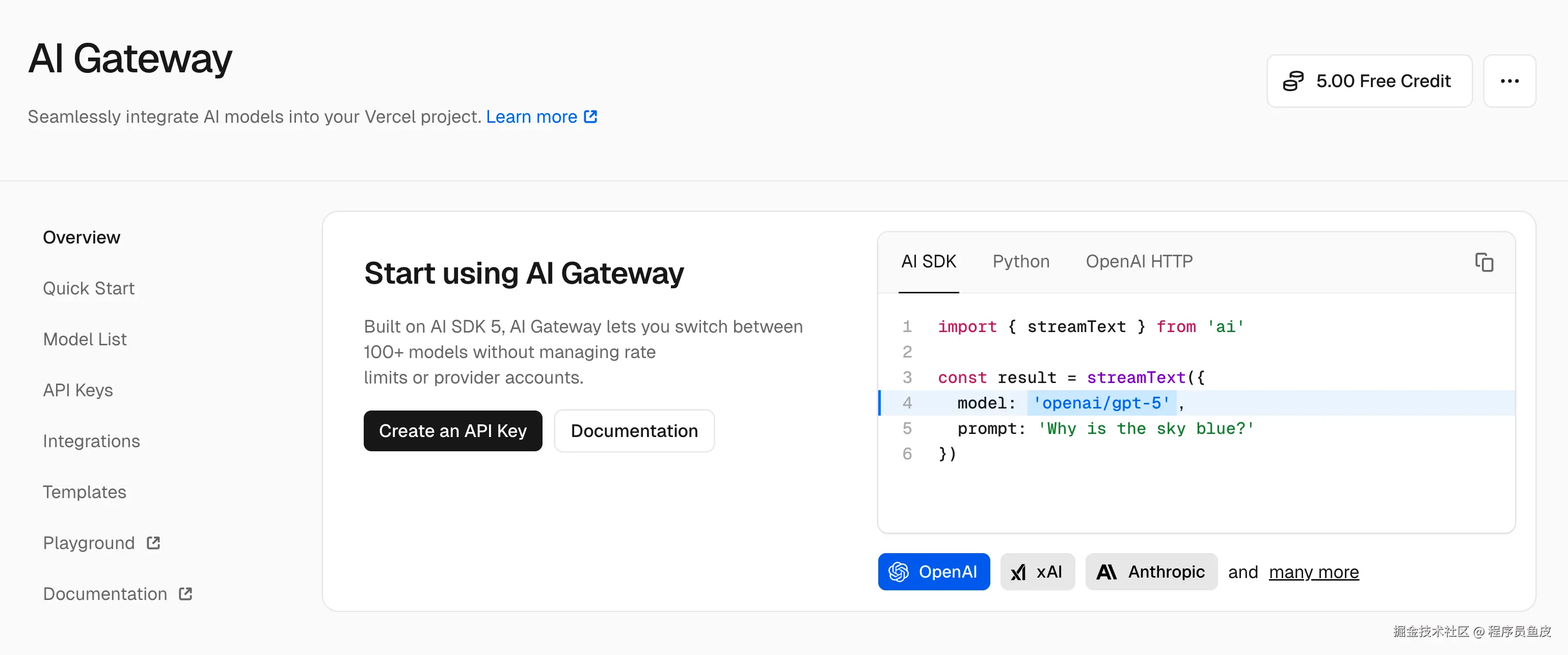 而且 Vercel AI Gateway 支持对接 500 多个大模型,还有免费额度,非常适合学习和小项目。