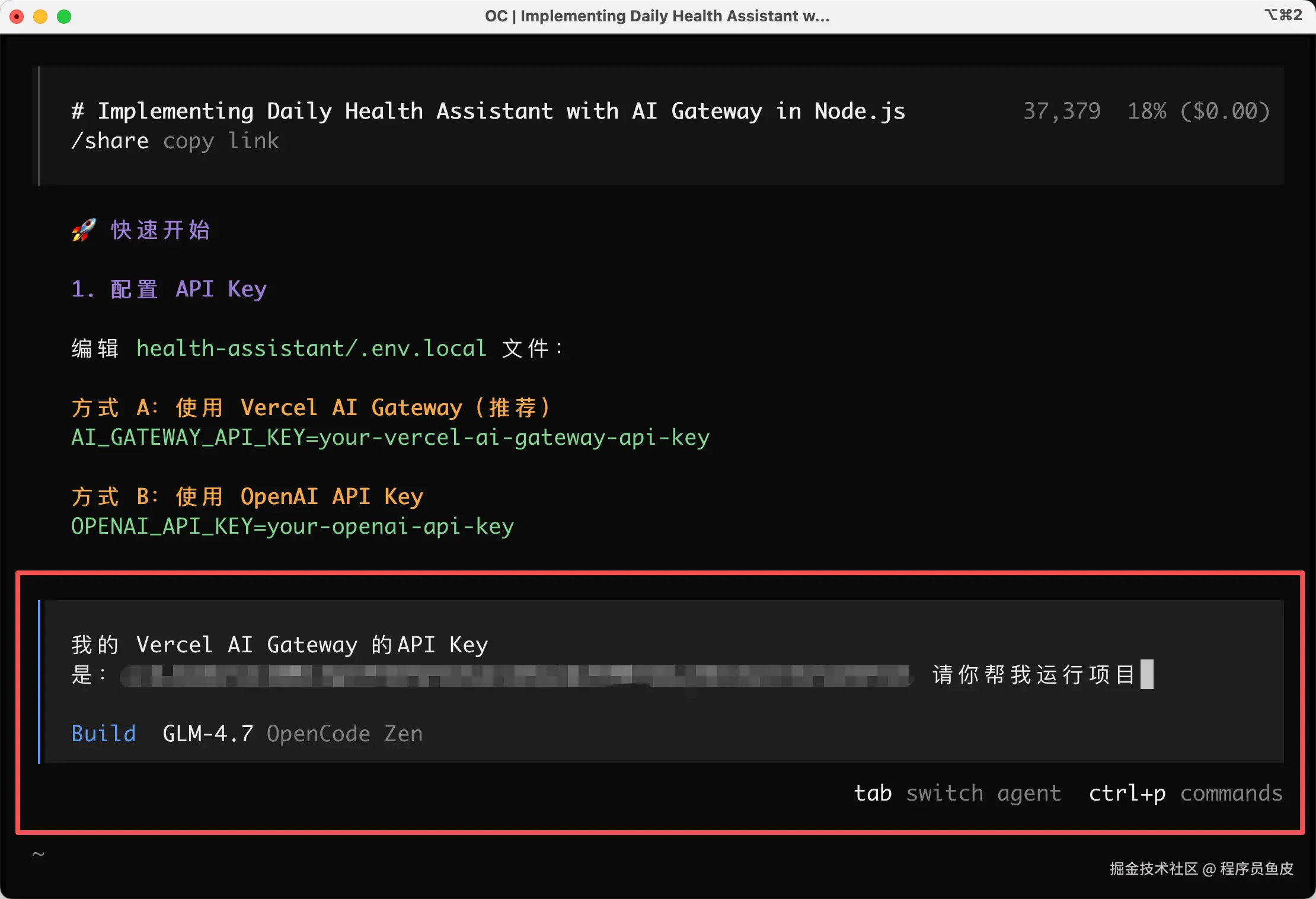 3)我直接把之前拿到的 Vercel 的 API Key 提供给 AI,让它帮我启动项目:
