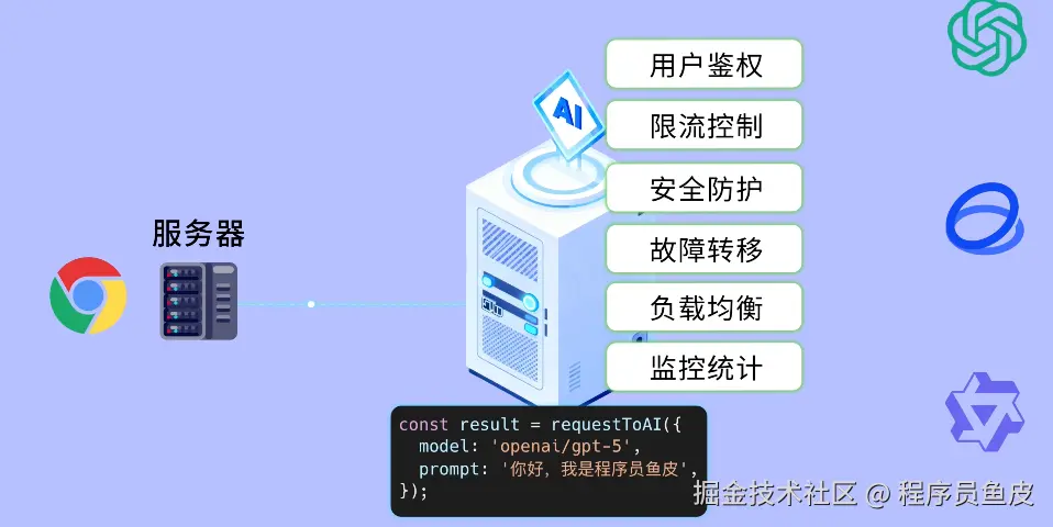 简单来说,它就像是火车站的检票口,你的应用发来的请求先经过网关,网关帮你处理认证、限流、监控等一系列复杂的操作,然后把请求转发给 AI 大模型。