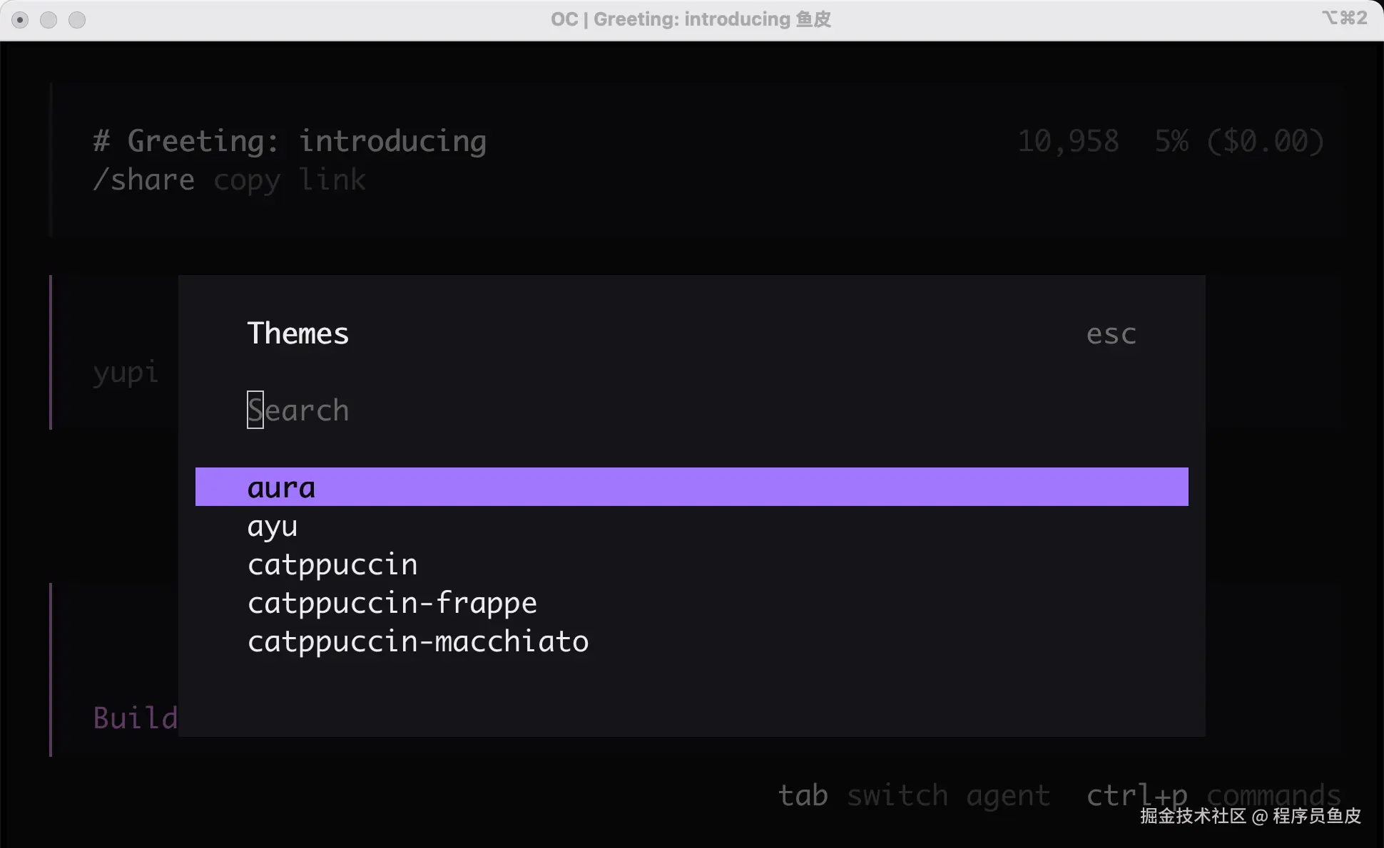 支持几十个不同的主题,颜值都挺高的,从这点也能看出来 OpenCode 很注重用户的体验: