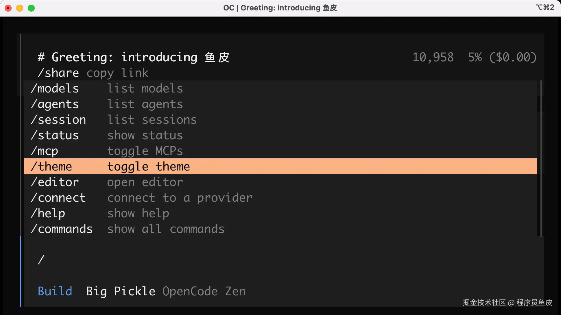 OpenCode 支持斜杠命令,输入 /,能看到很多操作,比如查看模型列表、查看 Agents、管理 MCP、切换主题等等: