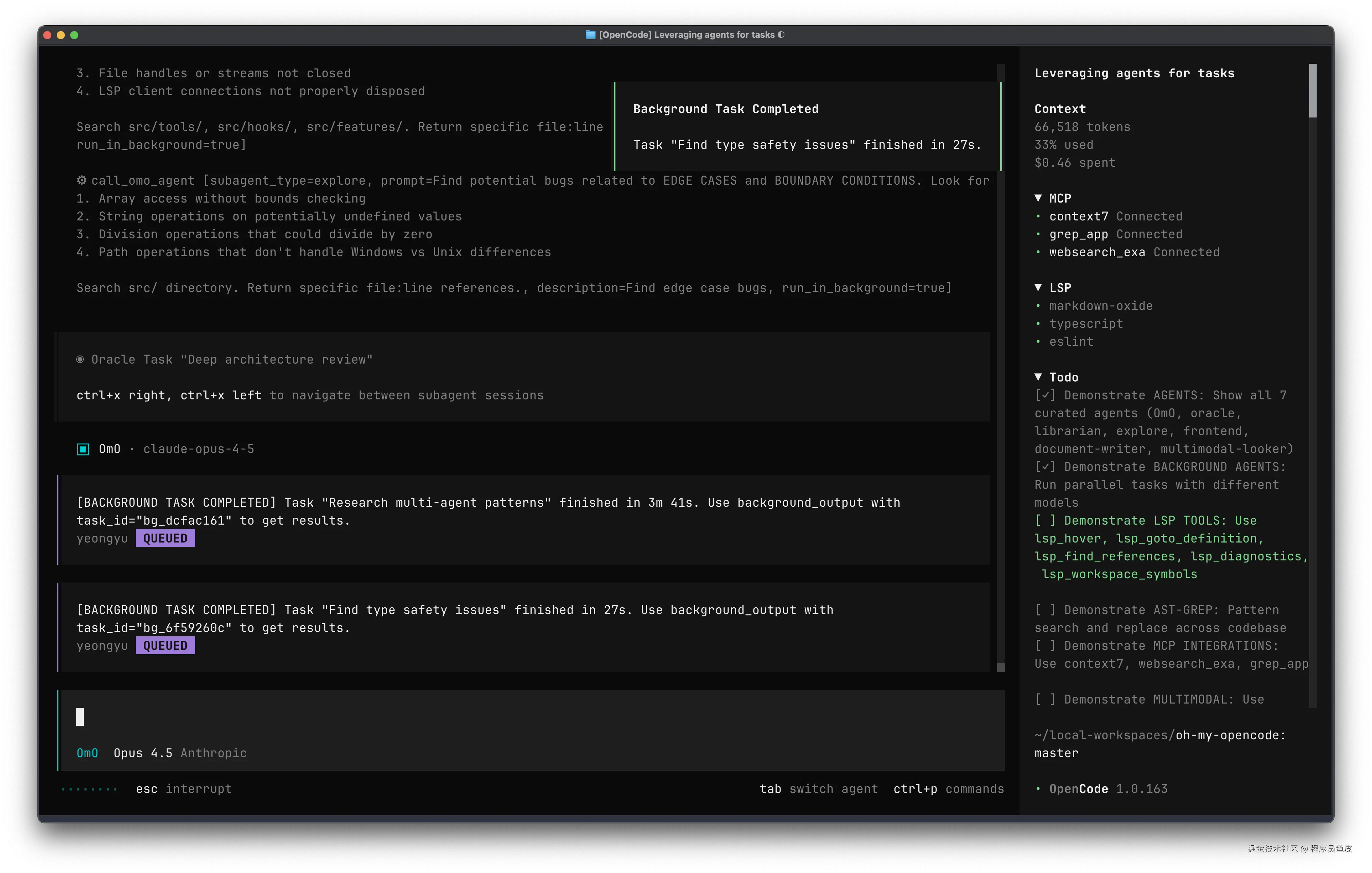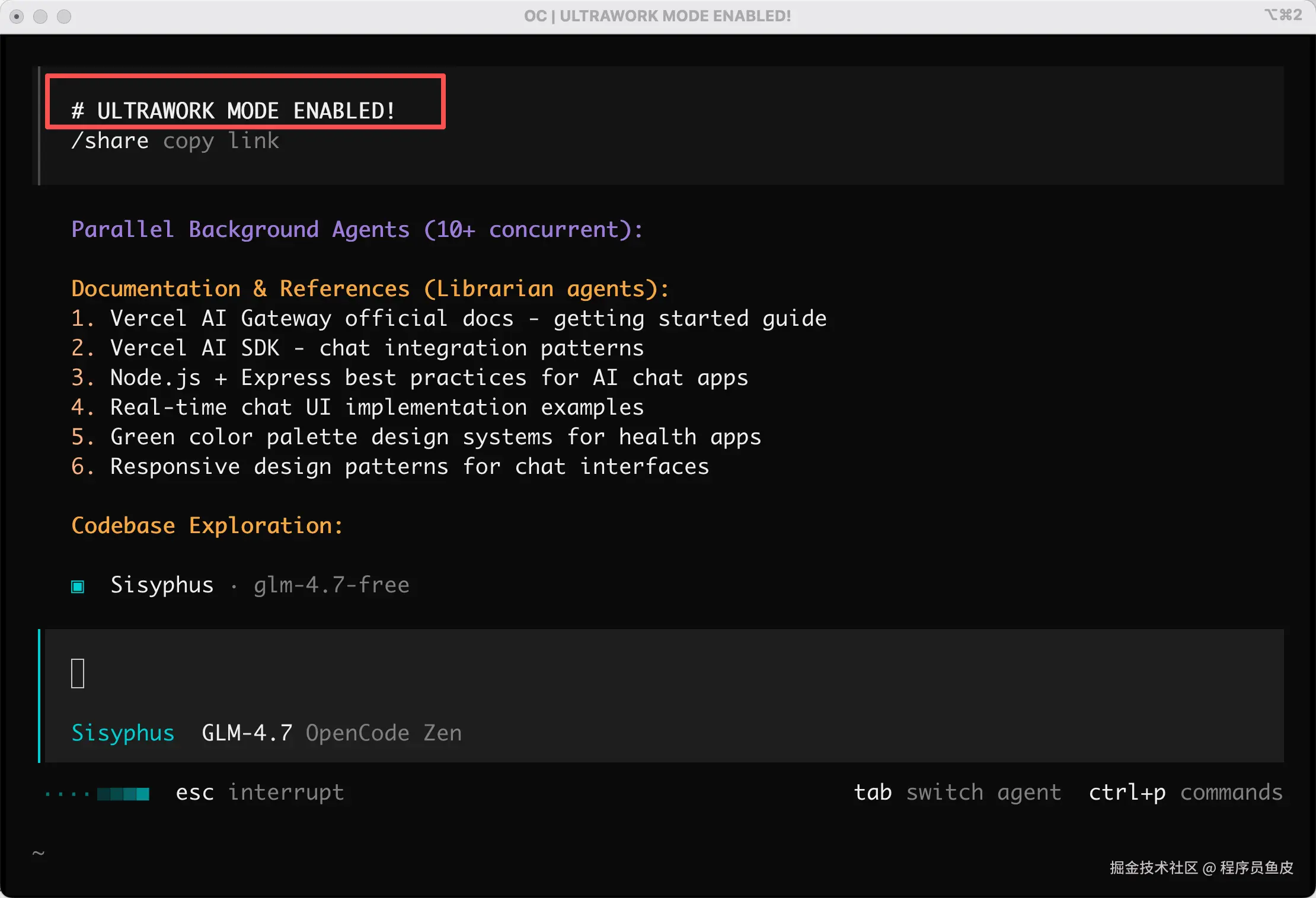 安装完成后,再次进入 OpenCode,之后只需要在你的提示词里加上 ultrawork(或 ulw)这个开挂咒语,就能激活全部增强功能。自动调度多个 AI 模型同时工作、深度探索代码库、锲而不舍地执行。