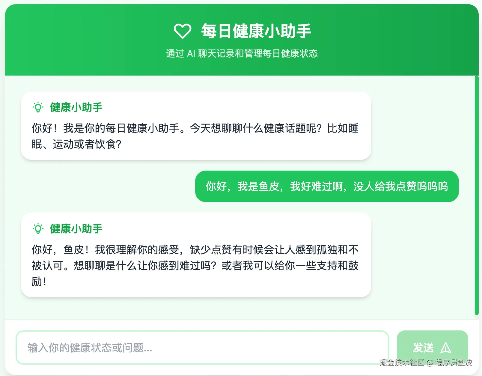 你是一位专业的程序员,请帮我开发《每日健康小助手》网站,用户可以通过和 AI 聊天来记录和管理每日健康状态。
