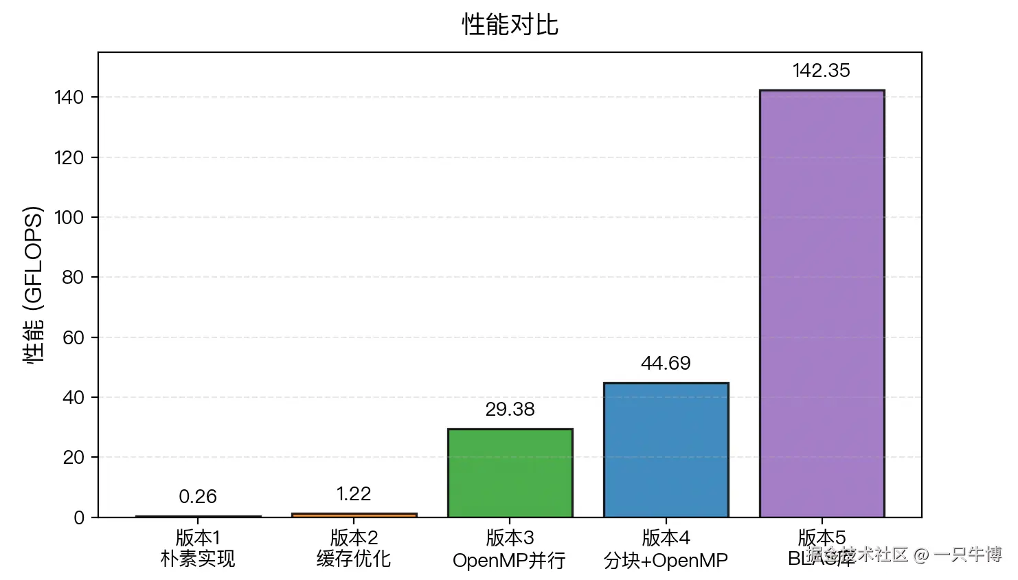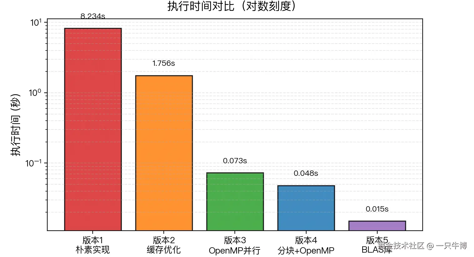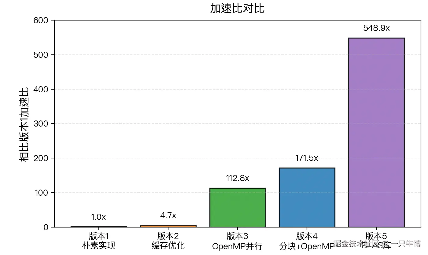 版本4→版本5(3.2x): 使用专业数学库,集成了所有优化技术加上SIMD向量化。