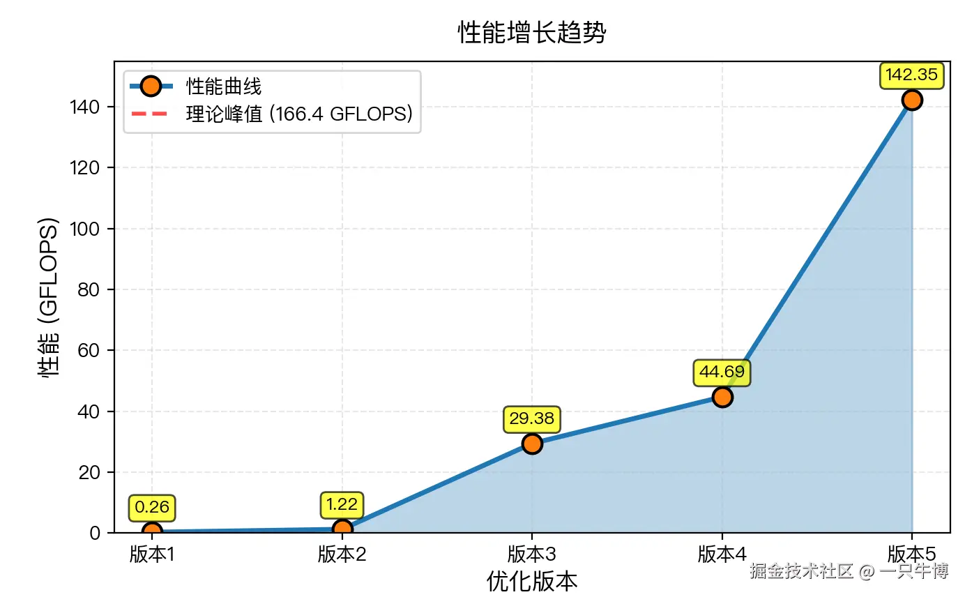 那么,怎么才能榨干这台机器的性能呢?答案就是叠加多种优化技术。这篇文章会带你继续往下走,从版本2的1.22 GFLOPS一路优化到版本5的142.35 GFLOPS,最终达到理论峰值的85.5%。整个过程会经历: