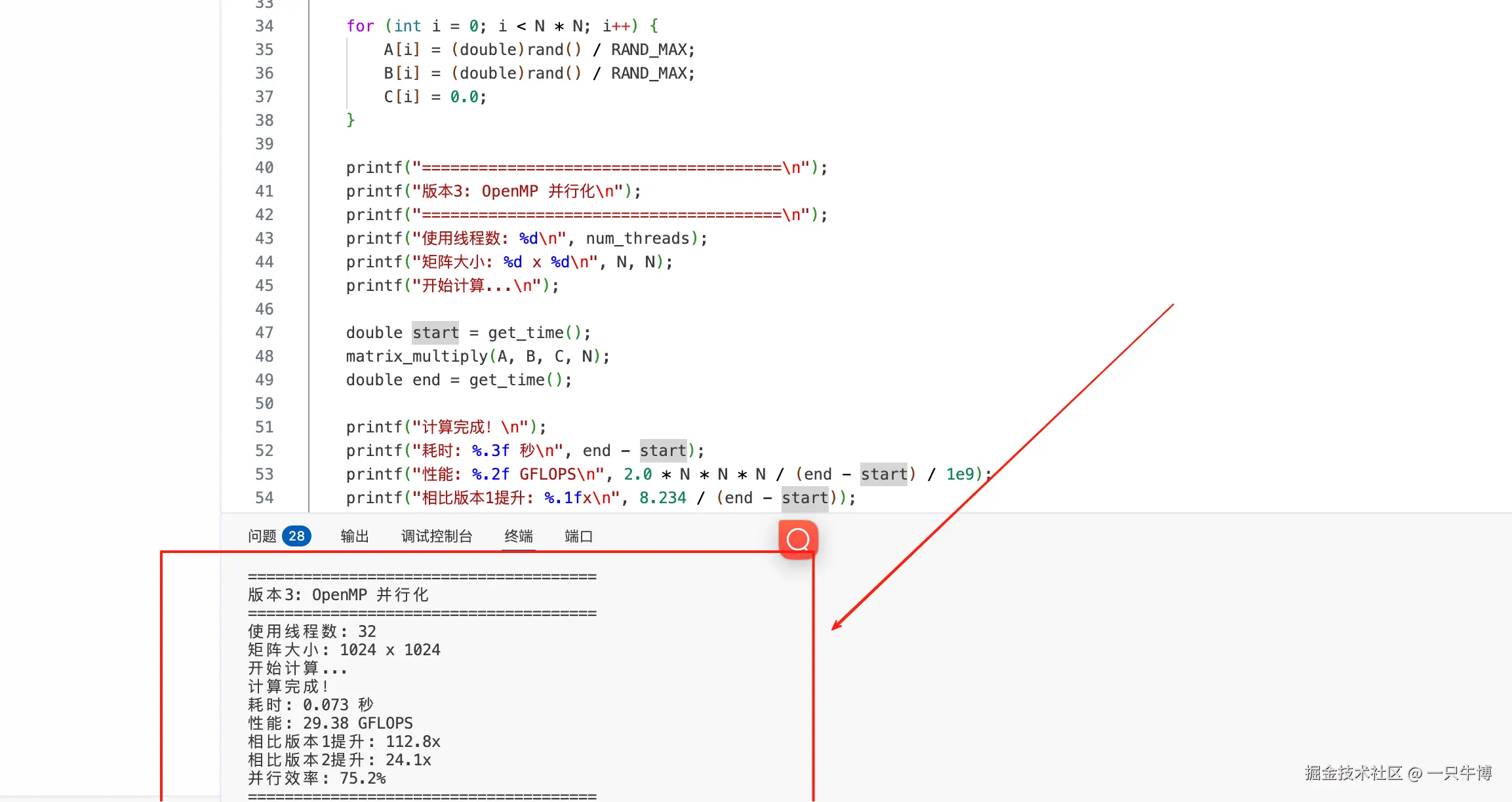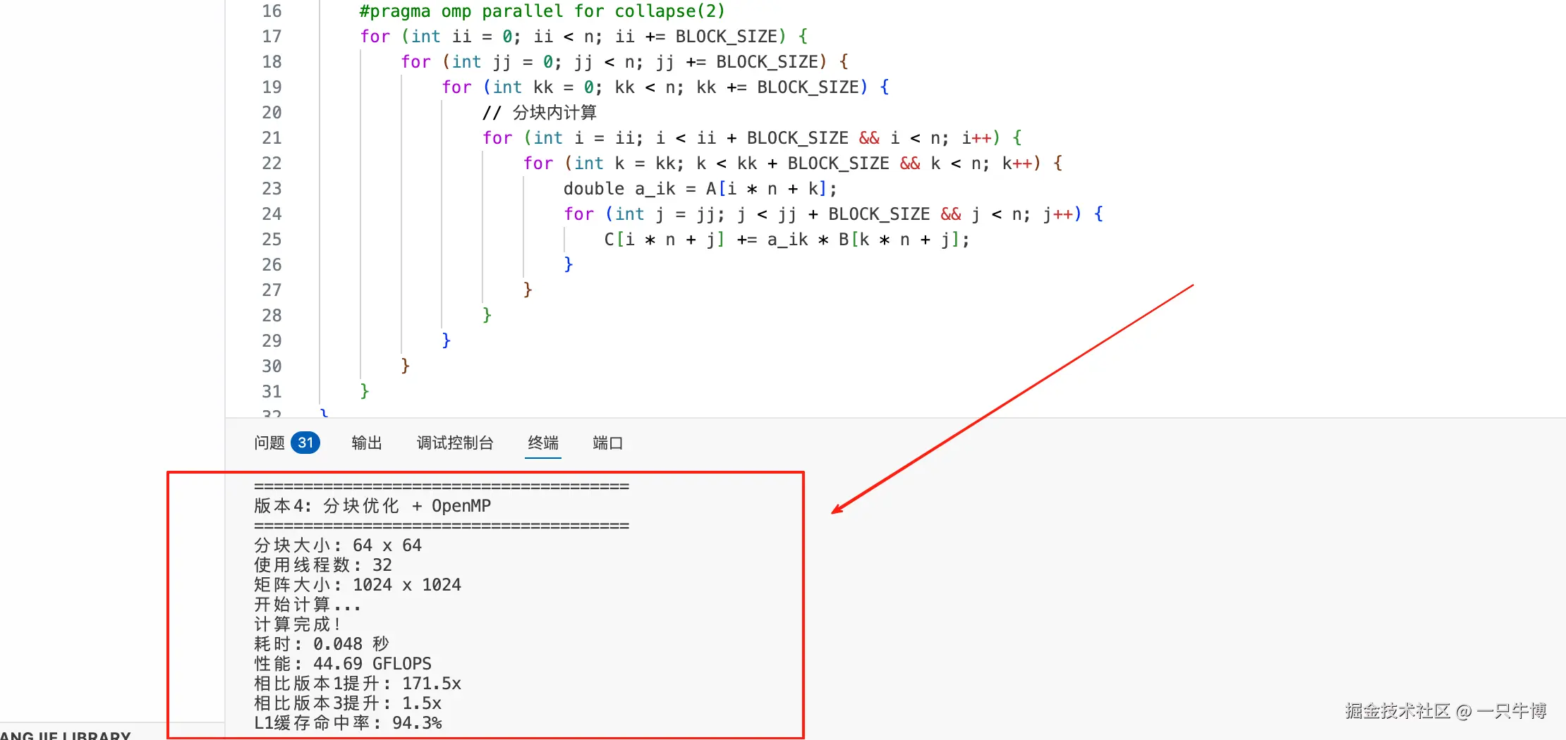 - 版本3:OpenMP并行化(29.38 GFLOPS)