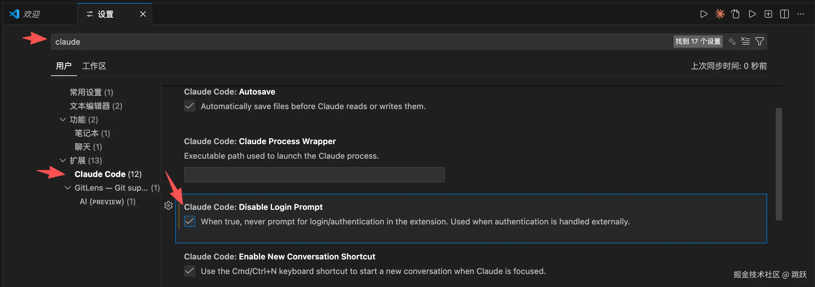 关闭登录提示,快捷键“Ctrl+, ”打开设置页面,然后搜索Claude,找到下方这个配置项,然后打上勾。