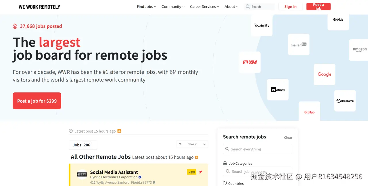 WeWorkRemotely 以远程工作信息为主,同时也包含一定比例的程序员接单或软件外包项目。平台整体偏展示型,对合作流程和交易环节的介入较少,更多是提供信息汇总和曝光。