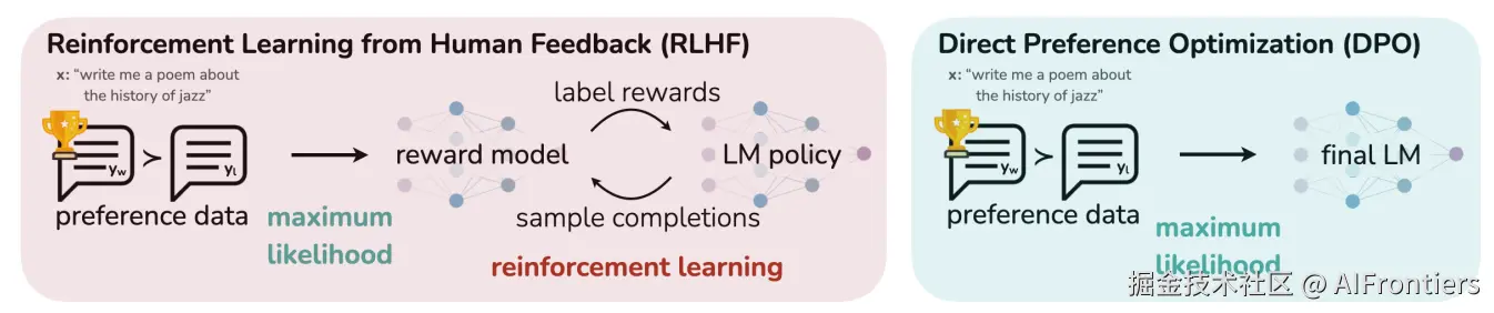 DPO正是在这一背景下诞生的创新方法,由斯坦福大学研究团队提出。其核心思想是摒弃「先训练奖励模型,再用 RL 优化策略」的两步流程,直接将人类偏好数据转化为对策略参数的二分类损失优化,大幅简化了训练链路。