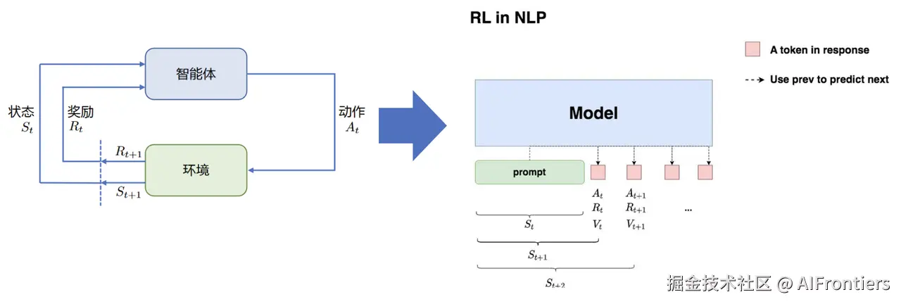 对应到 下,大语言模型就是智能体,输入的提示词 就对应状态 ,输出下一个 就是动作 ,对 进行打分就是奖励 ,整体目标就是给定,调整策略模型,生成符合人类喜好的。