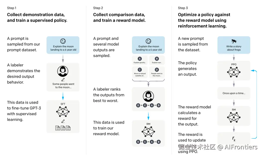 整个流程的核心是用人类偏好数据(演示、排序)指导模型训练,最终让大模型输出既有用、又符合人类意图的内容。