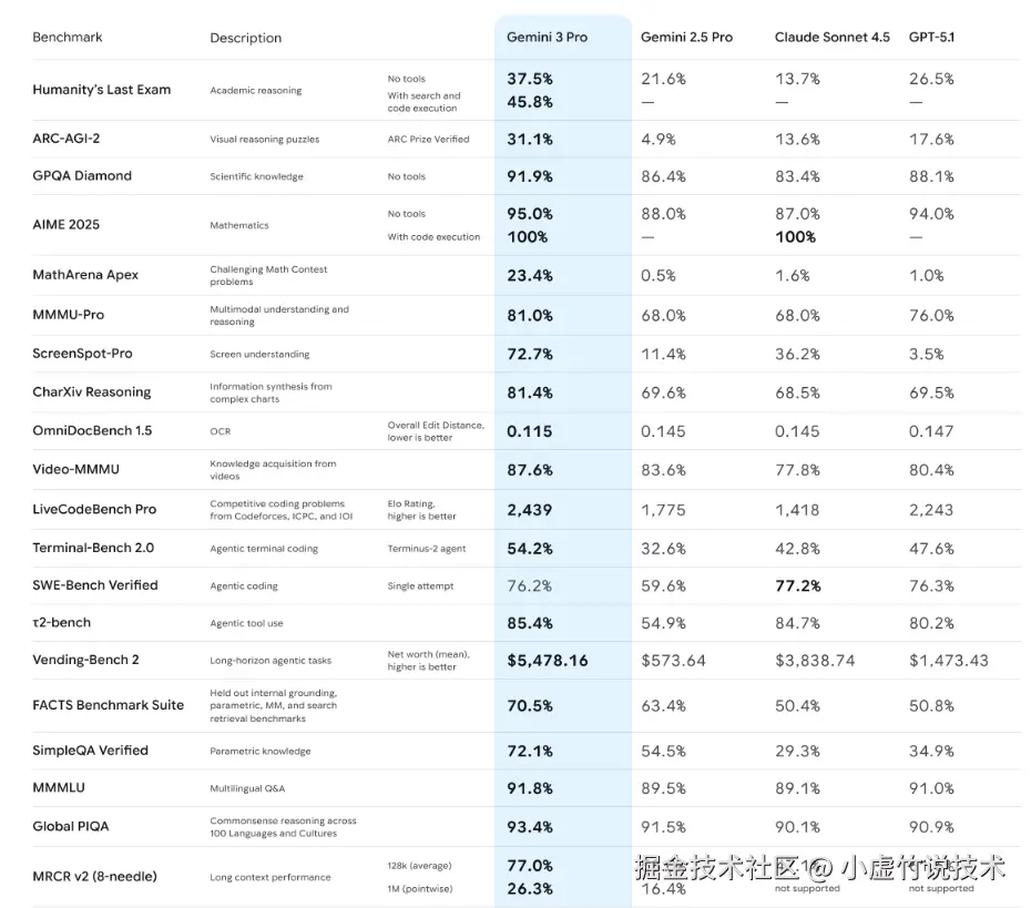 而且在多项权威基准测试中,Gemini 3 Pro 不仅干掉了自家前代,也把不少竞争对手甩在身后。