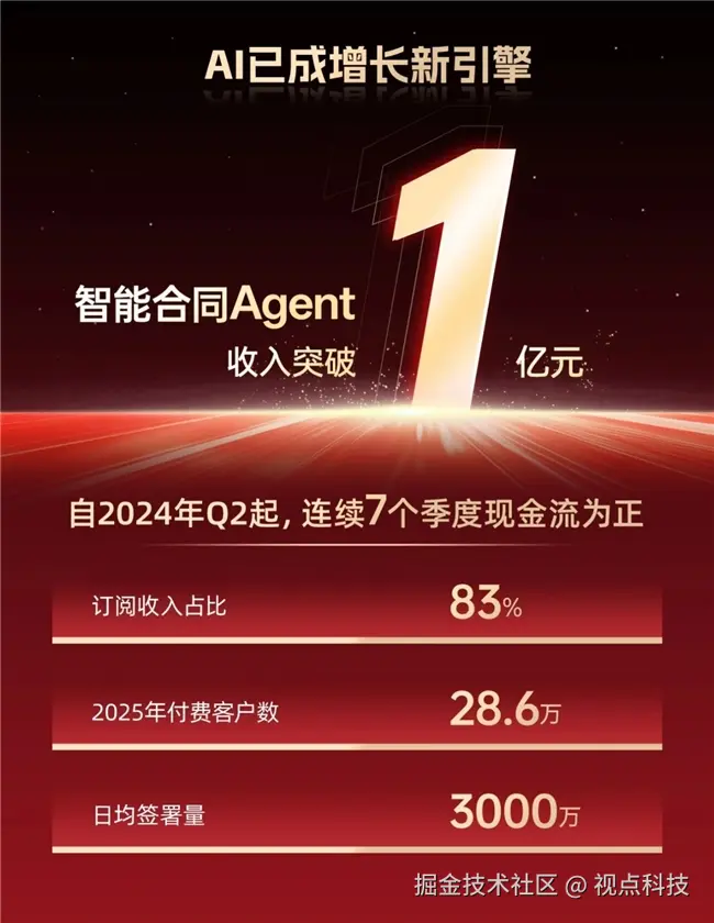 在积极推进转型的同时,e签宝保持了业务的稳健增长。公司订阅收入占比稳定在83%的健康水平,年度付费客户数达28.6万家,日均签署量突破3000万次,并已连续7个季度实现经营性现金流为正。这一扎实的基本盘为AI创新和全球化拓展提供了坚实基础。
