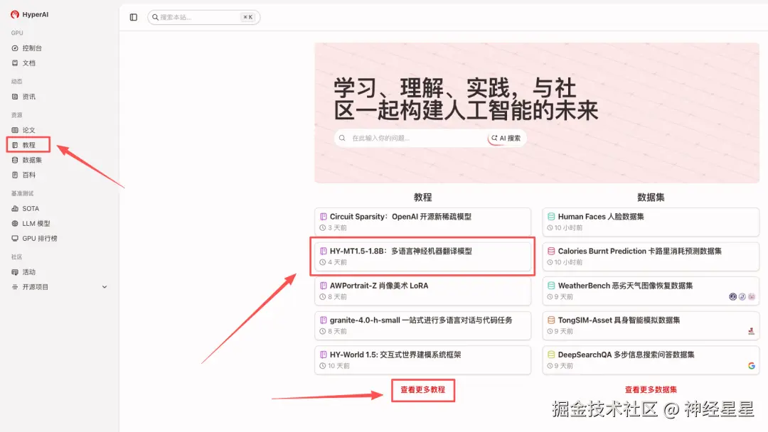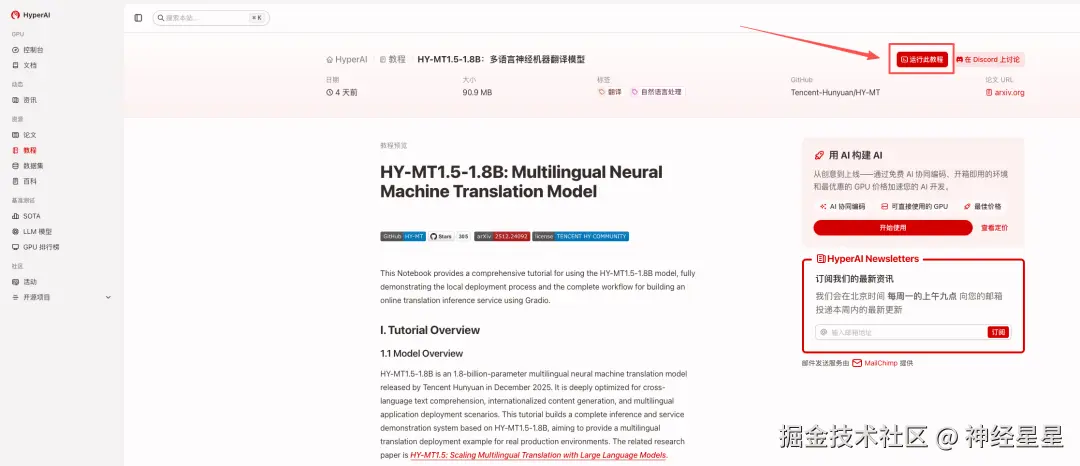 1.进入 hyper.ai 首页后,选择「HY-MT1.5-1.8B:多语言神经机器翻译模型」,或进入「教程」页面选择。页面跳转后,点击「在线运行此教程」。
