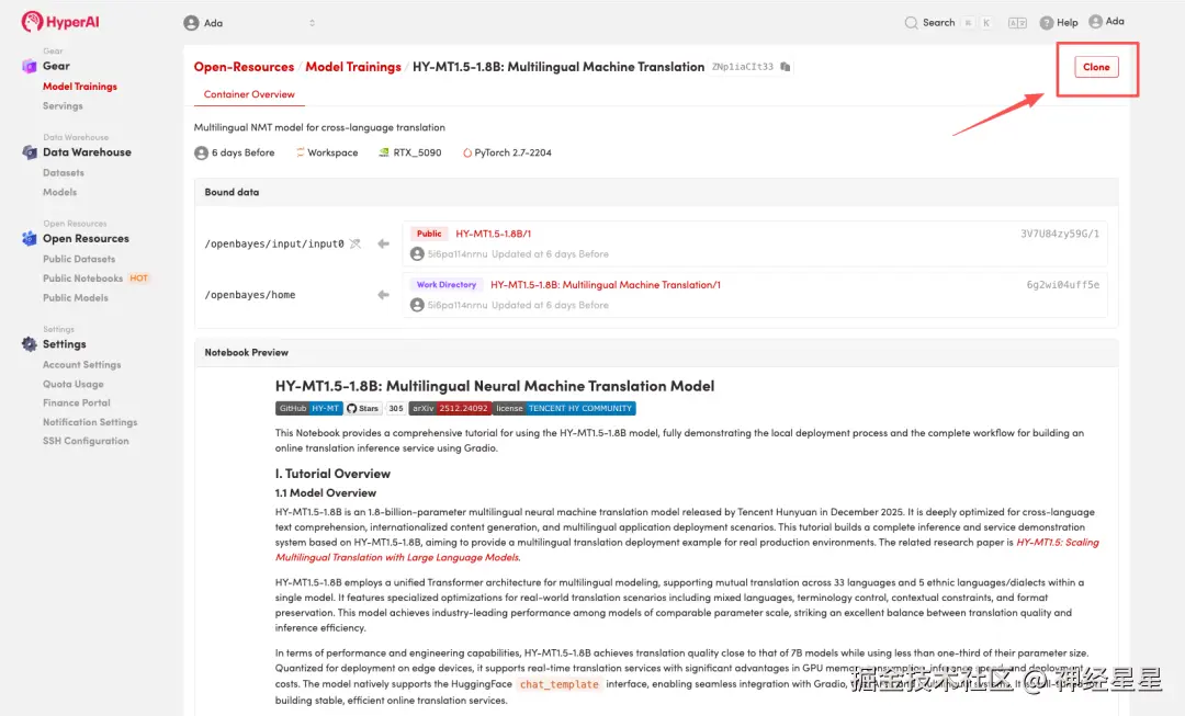 目前,「HY-MT1.5-1.8B:多语言神经机器翻译模型」已上线 HyperAI 官网(hyper.ai)的教程版块,快来体验极速翻译吧~