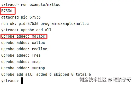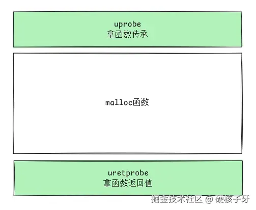 第一个问题,执行malloc函数,是如何执行到uprobe的?采用插桩的方式。核心代码长这样