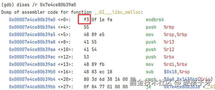 一、运行时Linux内核检测到malloc是监测点,临时插入断点,就是把malloc函数的第一个机器码0xf3改成0xcc,0xcc对应的汇编指令是int3,CPU执行0xcc就会触发3号软中断