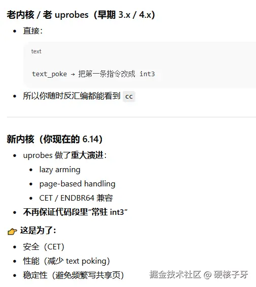 那是怎么回事呢?问ChatGPT,原来是新内核对uprobes底层做了改进