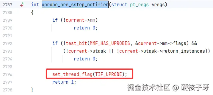 这里最重要的一部就是打上标记,最终执行uprobe代码是在返回用户态的路上做的