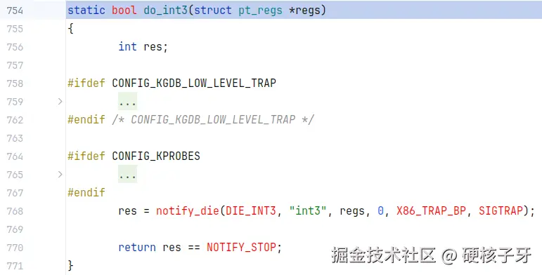 其实Linux内核也没做区分,Linux内核中有个die_notifier链,3号异常来了,先丢给优先级最高的notifier处理,ebpf插桩的优先级比gdb断点要高