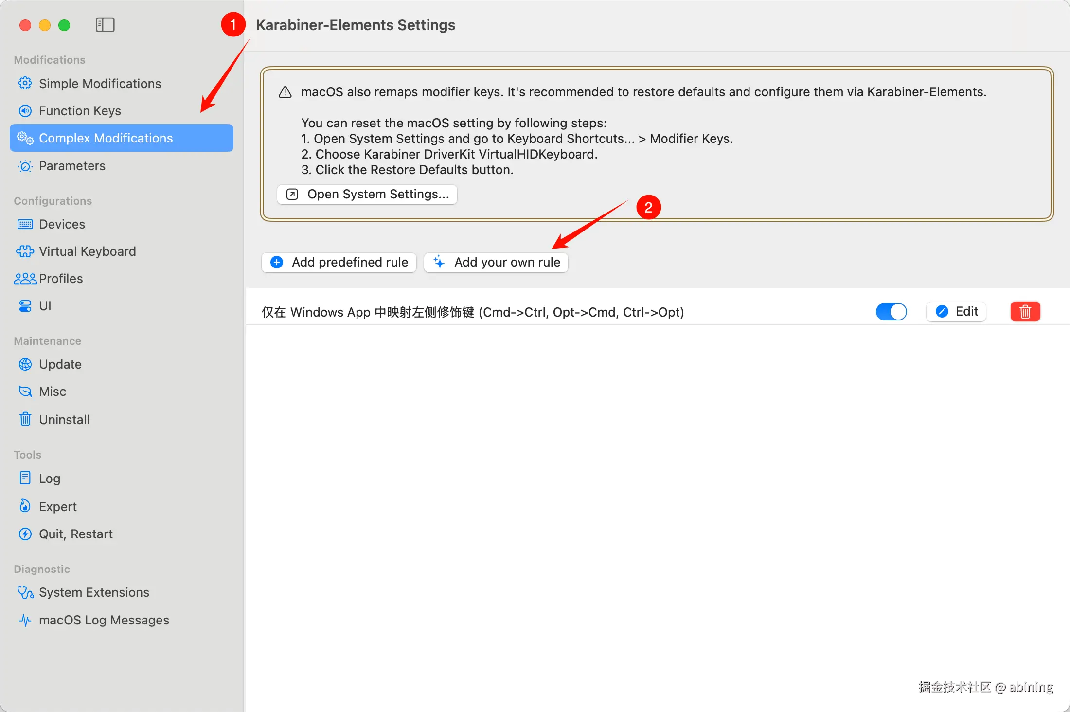 我在寻求解决方案时看到了一个社区讨论帖(V2EX 帖子),评论区中 @Mzs 提到了使用 Karabiner-Elements 进行针对性设置。