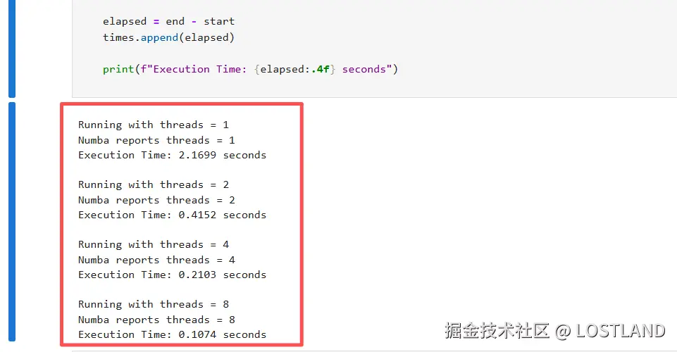OpenMP 线程级并行程序执行终端截图 展示了在不同线程数(1、2、4、8)下,Numba 报告的实际线程数及对应执行时间。可以看到,线程数设置与实际使用一致,程序能够正确利用多线程进行循环计算。
