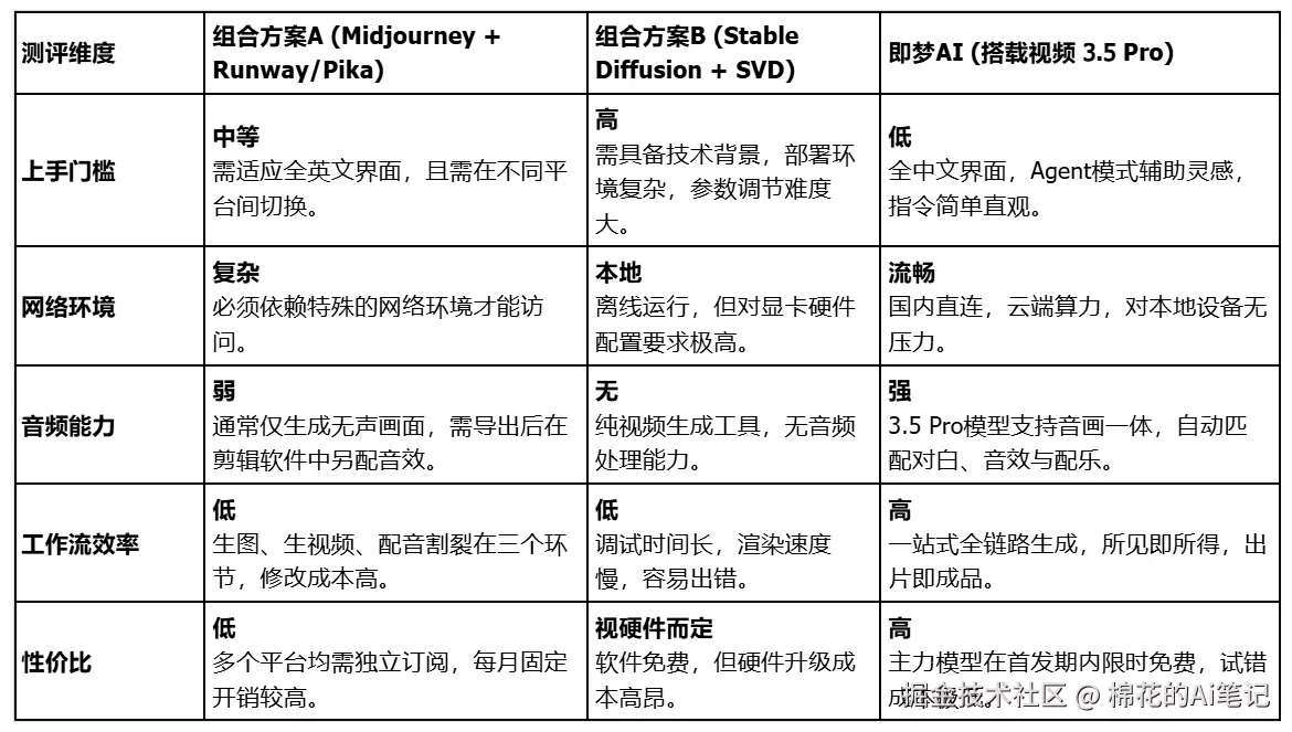 为了更清晰地回答新手怎么做电影级质感Ai视频这个问题,我们将即梦AI与市面上另外两类主流创作方案进行了多维度的横向对比。