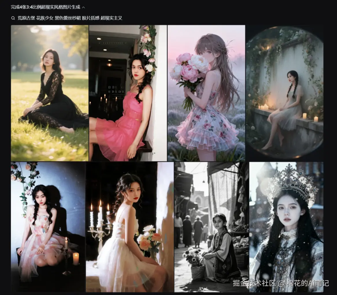 操作实录: 我在对话框中输入了基础构想:“荒原尽头的古堡残垣,花族少女穿着层叠破碎的黑色蕾丝纱裙,在狂风中伫立”。 系统随即通过**【灵感搜索】**功能,智能匹配了相关的视觉参考,并辅助生成了一段极具画面感的详细描述:“惊艳的面孔... 朦胧的胶片质感,油画般的重彩肌理,低饱和的大地色调...”。