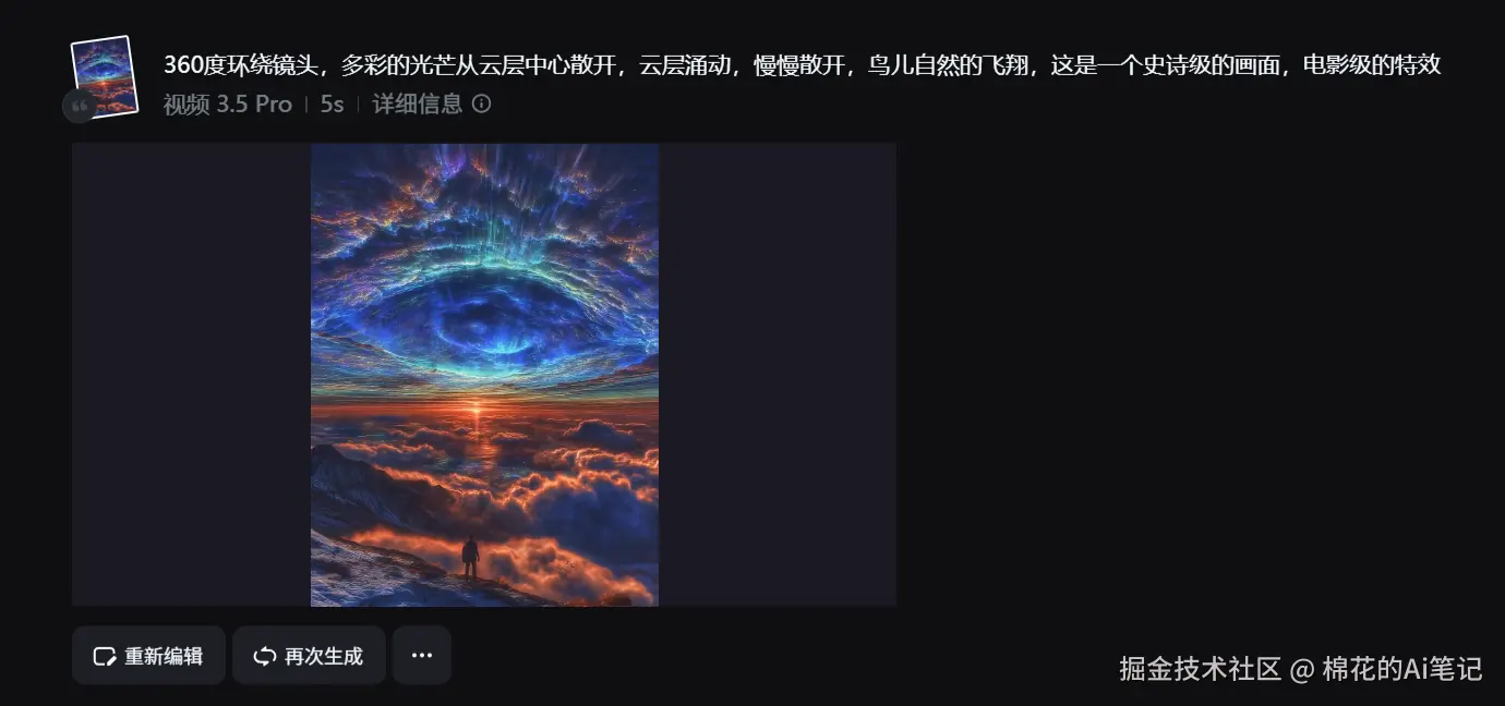 生成效果: 这是一个高难度的运镜指令。3.5 Pro 模型成功生成了平滑的环绕视角,云层中心的动态光效极具视觉冲击力,也就是文中提到的“史诗级画面”。 在音频方面,AI 识别到这是一个宏大、奇幻的场景,因此自动匹配了空灵、深邃的氛围音效,极大地增强了画面的沉浸感。