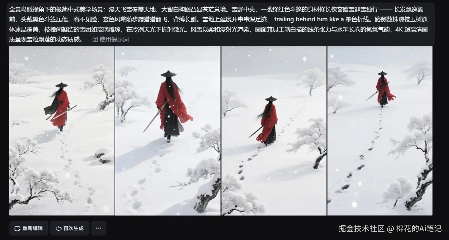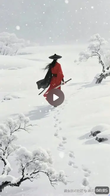 第一步:准备素材 我们选用一张极具意境的“雪中红衣剑客”图片。画面中大面积的留白和雪地纹理,非常适合测试AI对环境氛围的理解。
